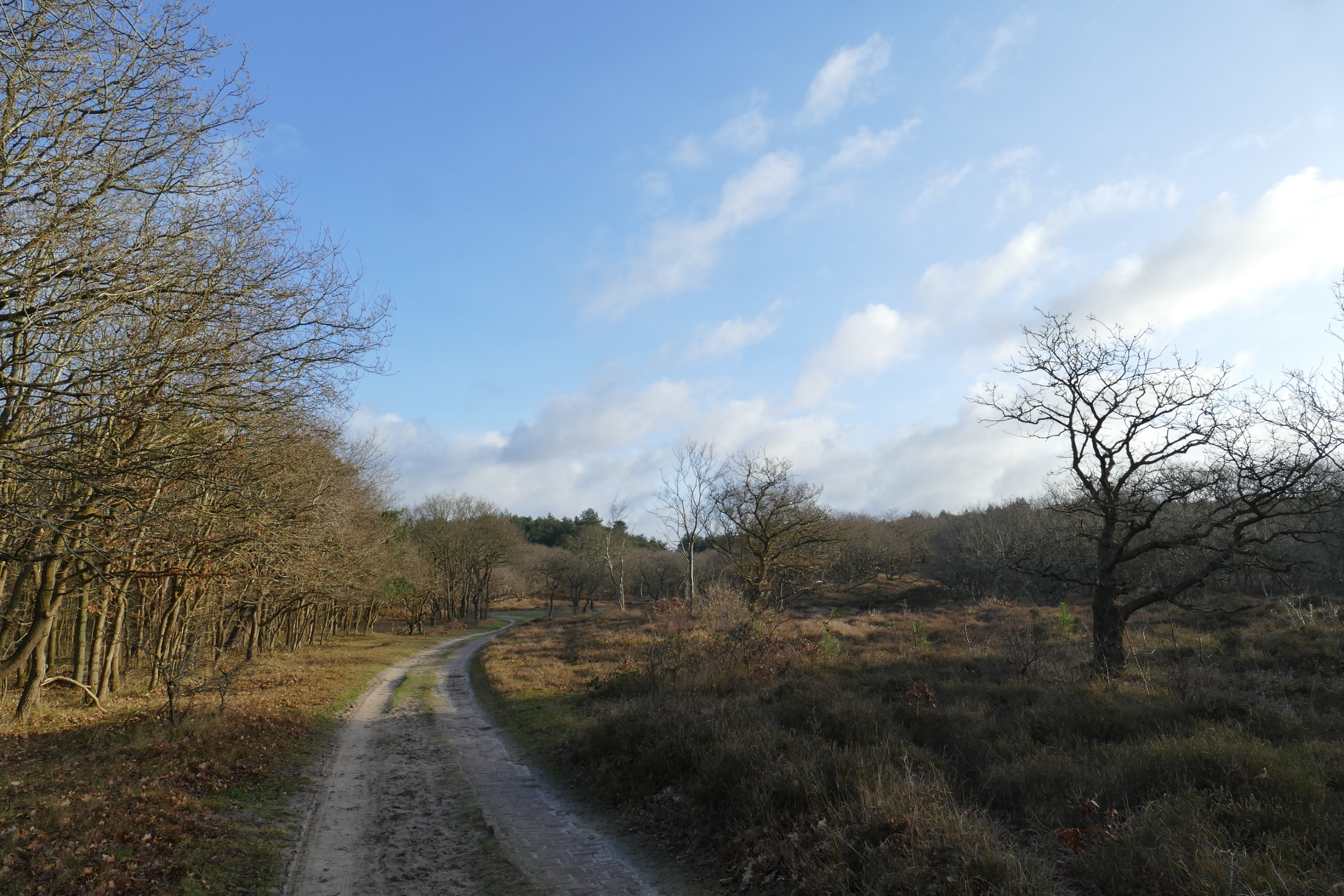 Door open duinen wandelen we weer richting de auto. Even verdween de zon achter een hoge sliert wolken, maar wat later ligt het landschap weer te baden in het februarizonlicht.