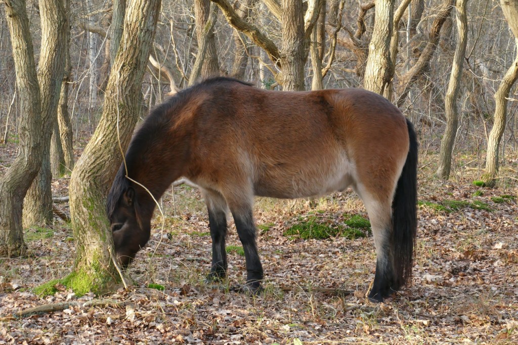 We komen een familie Exmoor pony’s tegen… Wat zijn dat toch mooie beesten! Ze dwalen op hun gemakje door het bos, waar ze beschut zijn tegen de koude westenwind.