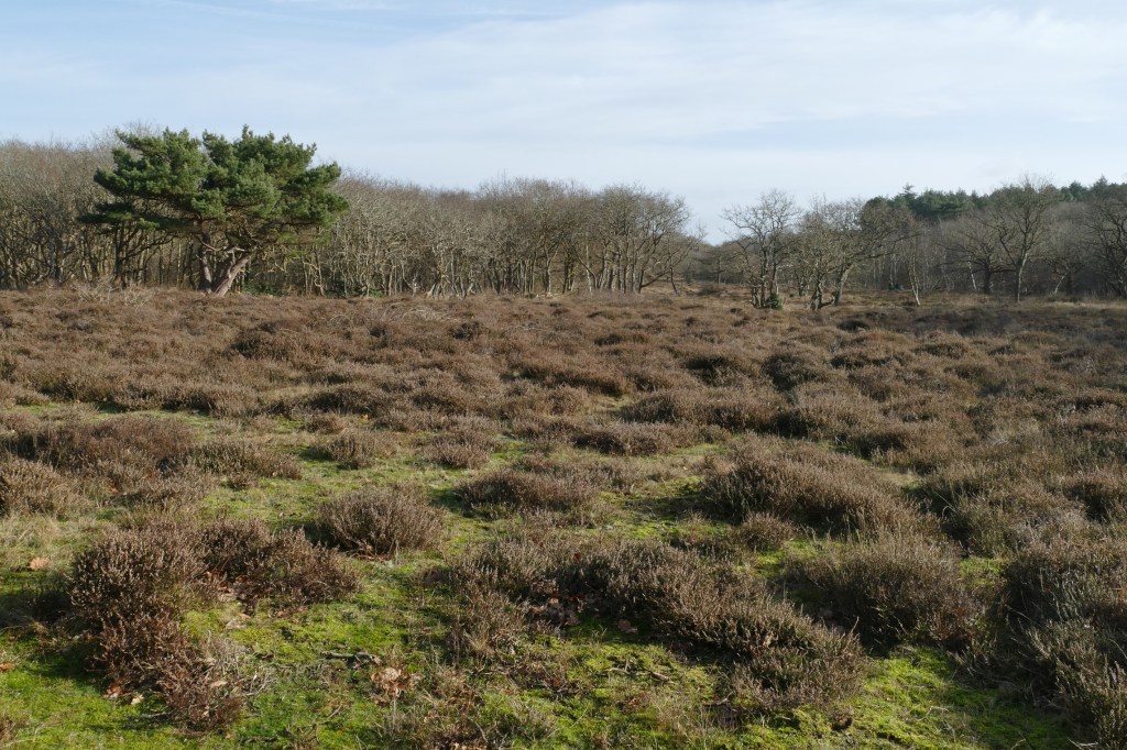 Nu ik weer werk, vind ik het niet vanzelfsprekend om elke vrije dag een stukje te gaan lopen. Het is lekker om ook eens thuis te blijven… Voor zondag wordt echter een zondvloed voorspeld, dus trekken we er vandaag op uit. We parkeren aan het begin van de Zeeweg en lopen het duingebied in dat de Verbrande Pan heet. De lucht is Mariamantelblauw. De takken en twijgen van de talloze duineikjes vormen een wirwar van lijntjes tegen helverlichte hemelkoepel…