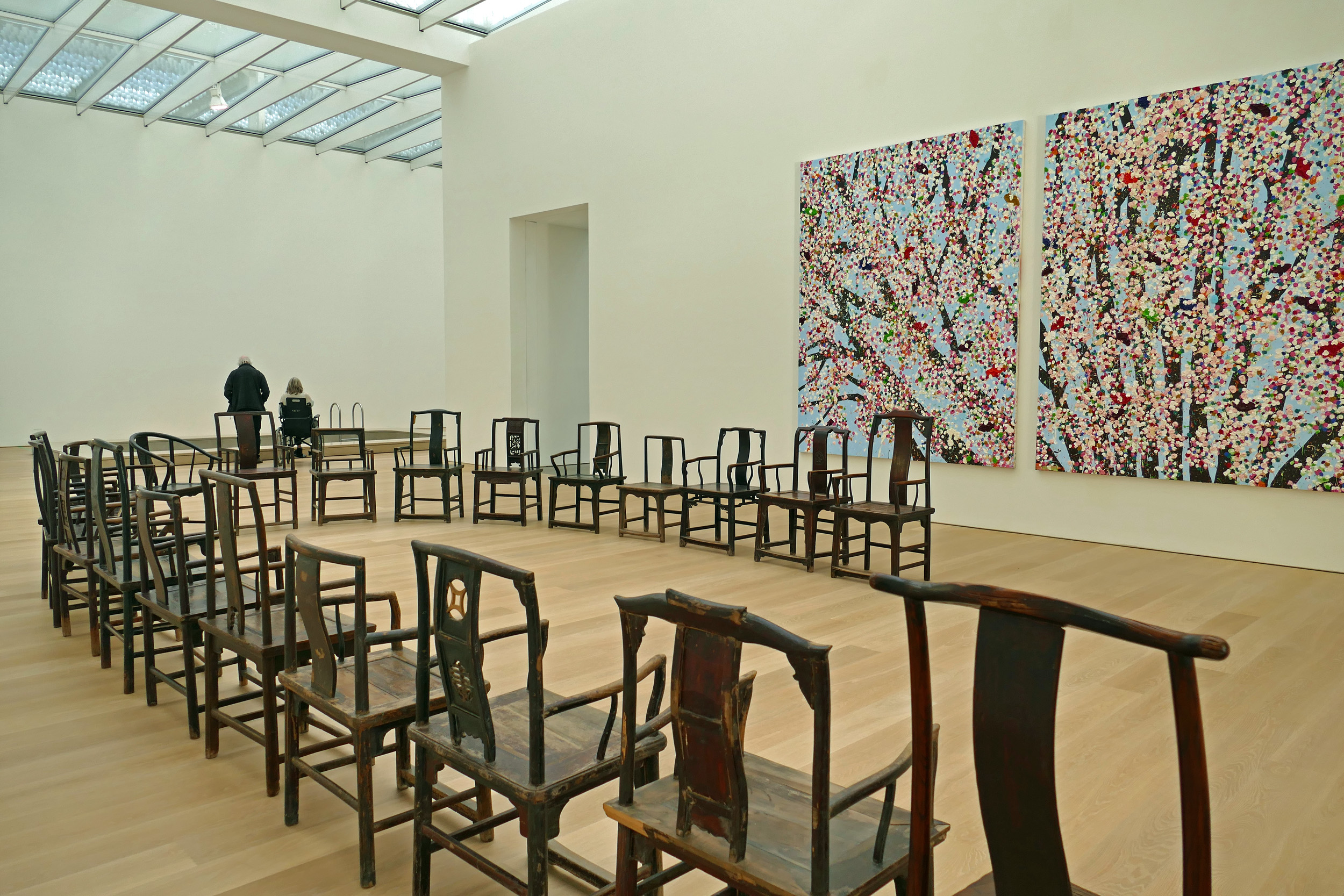 We liepen de tentoonstelling Picasso-Giacometti uit en kwamen terecht in een grote, lichte zaal met aan de muur een enorm schilderij van bloesems, dat meteen een lentegevoel opriep en een werk van Damien Hirst bleek te zijn: Hidden secret blossom (2019). Verder stond er in de ruimte een rij stoelen opgesteld in een halve ovaal: daar hoort een bijzonder verhaal bij dat ik overneem uit de folder die elke bezoeker ontvangt bij een bezoek aan het museum.
