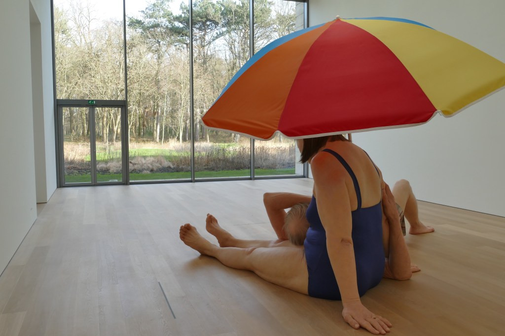 Eén zaal verder zat een koppel onder de parasol… Een werk van Ron Mueck, met de naam Couple under an Umbrella (2013). Mueck maakt hyperrealistische mensfiguren die hij tot in de kleinste details uitwerkt. Op de foto’s is niet goed te zien hoe groot de figuren zijn maar ik schat 2,5 à 3 keer zo groot als een mens. Het beeld is gemaakt van siliconen en fiberglas.