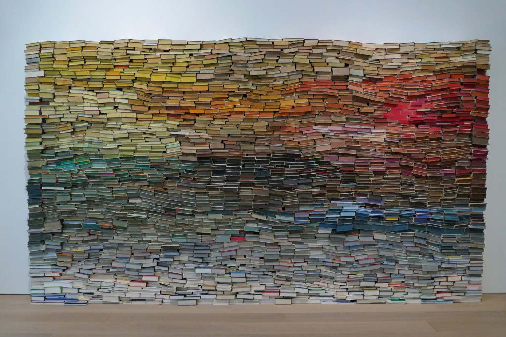 Het eerste werk is van Anouk Kruithof, is gemaakt van boeken die ze her en der gevonden heeft (ik vermoed dat ze aardig wat antiquariaten en kringloopwinkels heeft afgedweild) en waarmee ze Enclosed content chatting away in the colour invisibility (2009) heeft ‘gecomponeerd’.