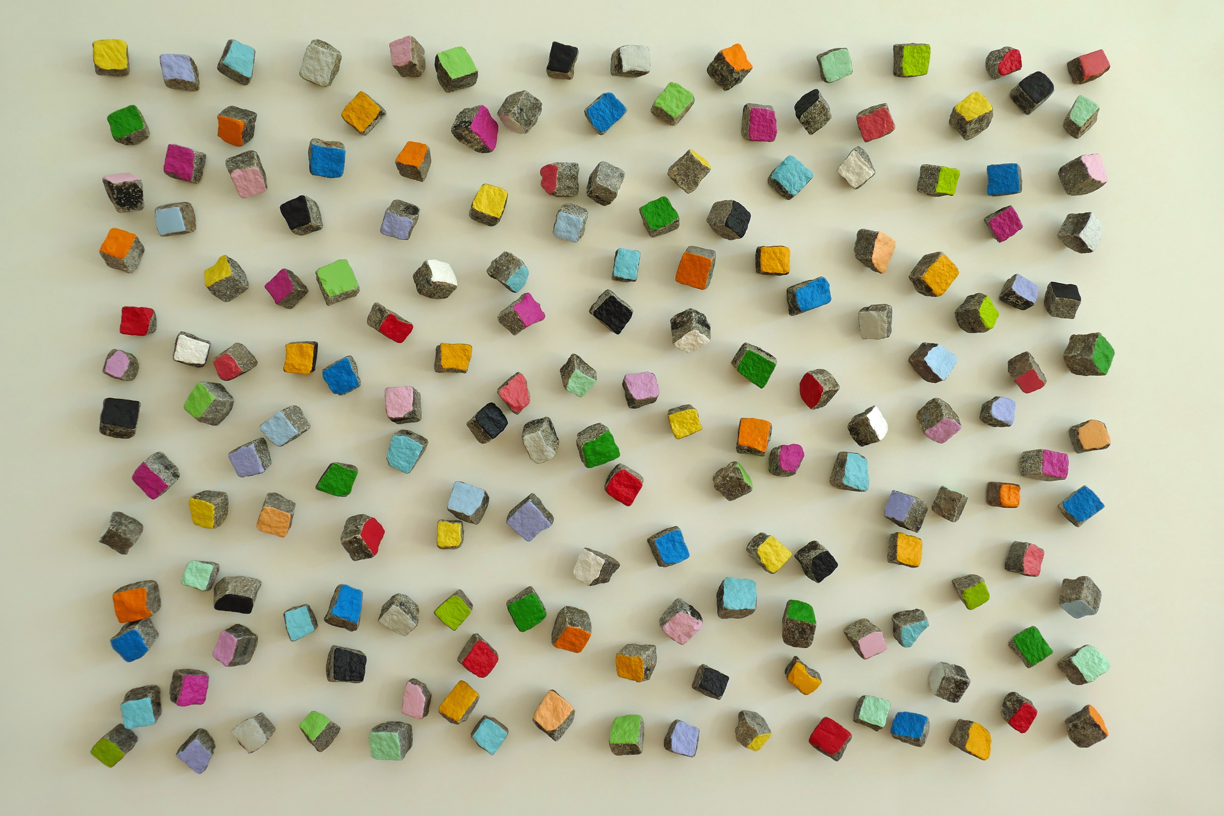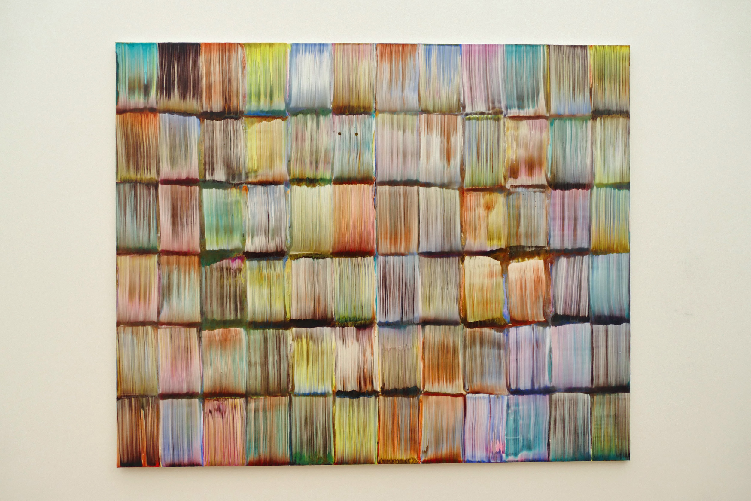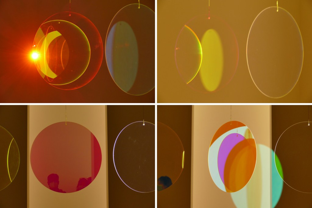 Waar ik uren naar had kunnen blijven kijken, was Olafur Eliassons Retinal flare space (2018). Drie transparante schijven hangen achter mekaar en draaien langzaam rond in de ruimte. Iedere schijf bevat een kleurfilter (cyaan, magenta, geel). Een projector werpt licht op de schijven. Op de foto’s zie je wat er gebeurt. Fascinerend! En in feite kinderlijk eenvoudig…