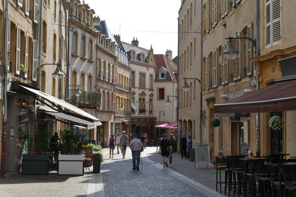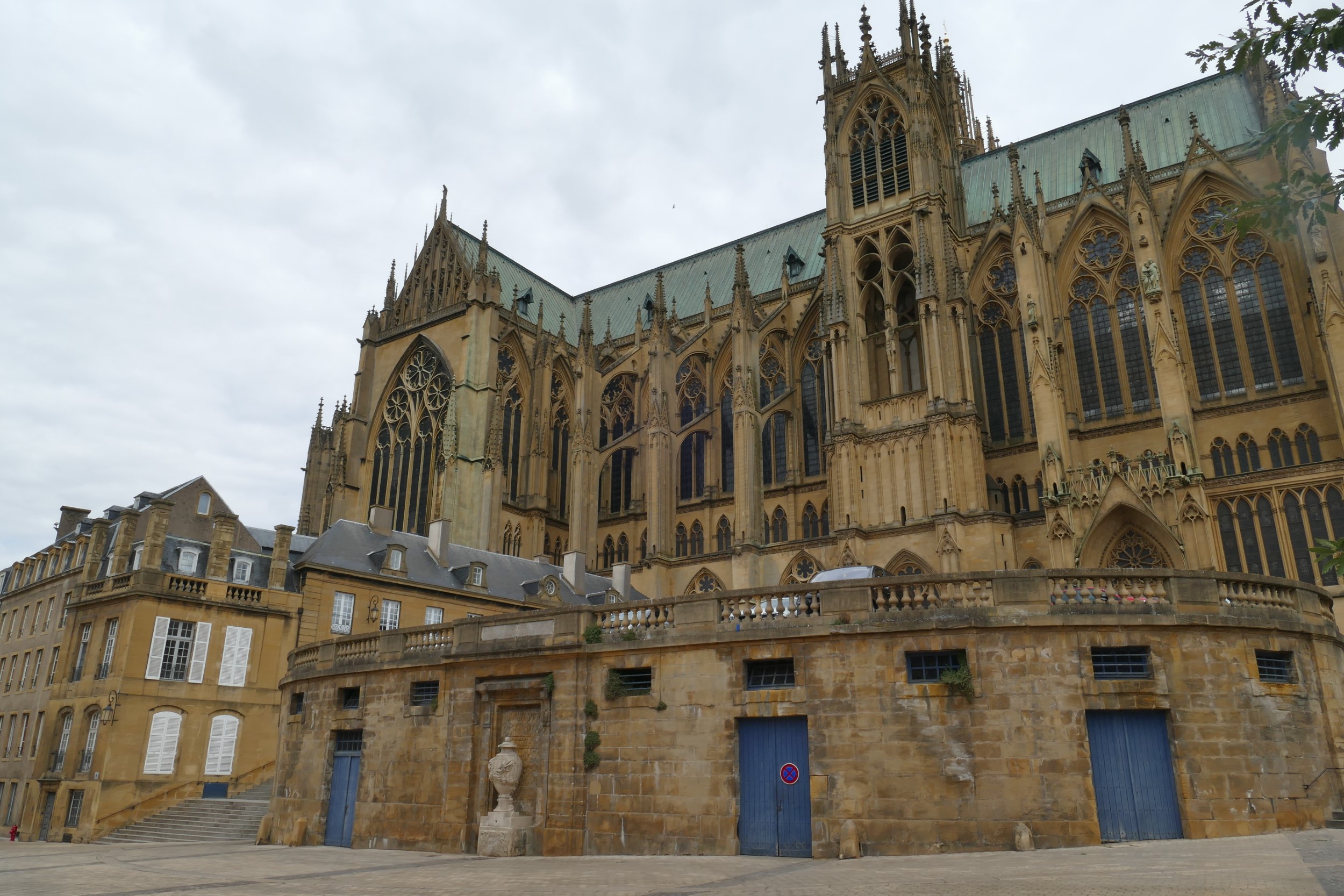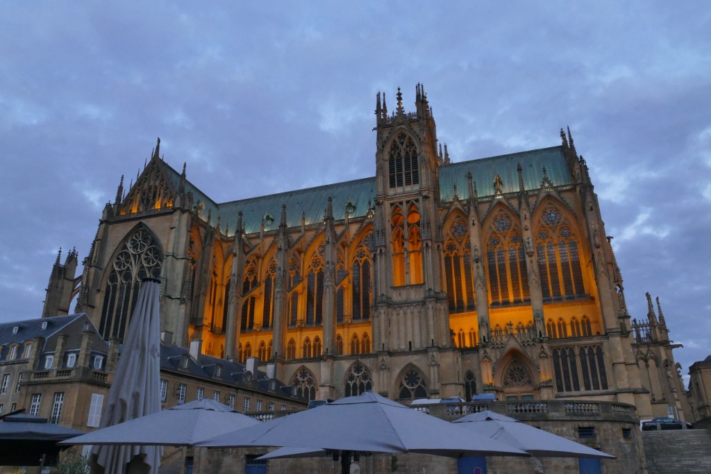 Metz blijkt een mooie, bruisende stad te zijn waar we ons meteen thuis voelen. Voorzien van voldoende water en een goed stadsplannetje gaan we op stap. In eerste instantie verkennen we de straatjes en pleinen rondom de kathedraal, waar ook de Marché Couvert is. De Cathédrale Saint-Étienne staat op een kleine heuvel (tevens het hoogste punt van de stad) boven de Moezel, de rivier die door Metz stroomt. Het prachtige gotische bouwwerk ‘ontstond’ in de 14de eeuw door de samenvoeging van twee kleinere kerken, en werd in de eeuwen daarna verder vergroot. Het schip is het op twee na hoogste van Frankrijk: je treedt dus een enorm ruimte binnen…