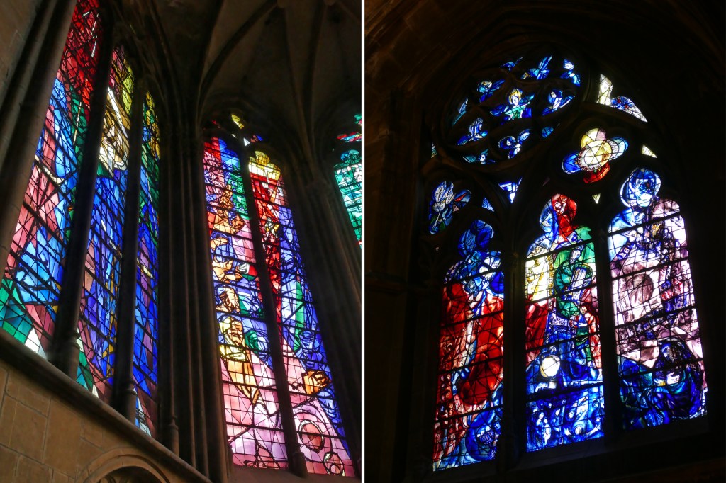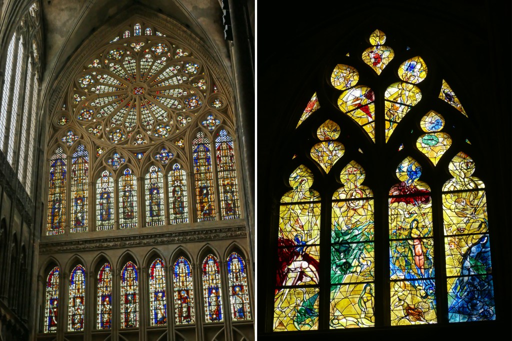 Het meest indrukwekkende vind ik de enorme glas-in-loodramen. De oudste dateren uit de 13de eeuw maar er zijn er ook nog in de 20ste eeuw toegevoegd, ontworpen o.a. door Jacques Villon (1957, kapel van het Heilige Sacrament) en Roger Bissière (1960, onder de torens). De meest bekende zijn die van de hand van de beroemde kunstenaar Marc Chagall.
