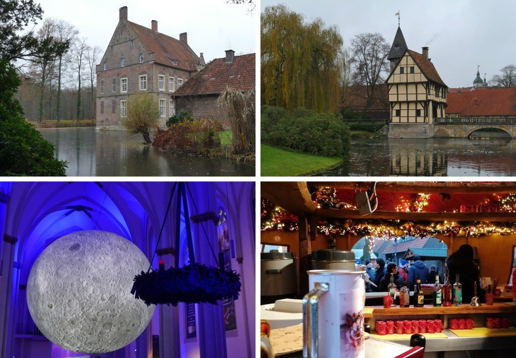 ’s Anderendaags reden we naar Münster. Onderweg bezochten we landgoed Welbergen (een havezate in het water – een prachtig huis) en het stadje Steinfurt met zijn bijzondere kasteel. In Café am Markt warmden we op voor we de laatste kilometers naar Münster reden. Daar bewonderden we het enorme Schloß en gingen de stad in waar we vier van de vijf kerstmarkten bezochten. In een van de kerken hing een enorme replica van de maan, in een andere was het licht van Bethlehem gearriveerd en stonden de mensen in de rij om er hun eigen kaarsje of lantaarntje mee aan te steken…