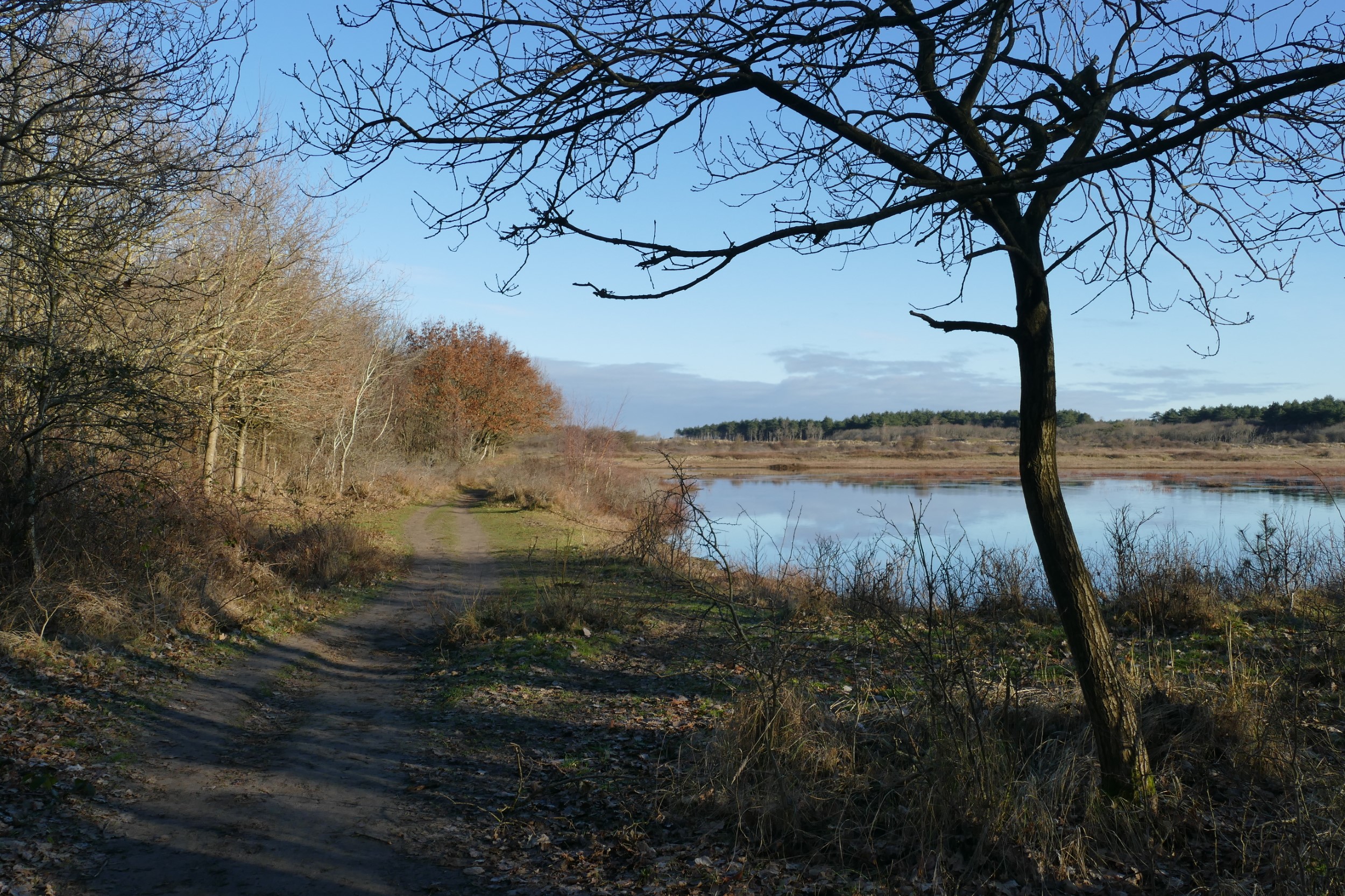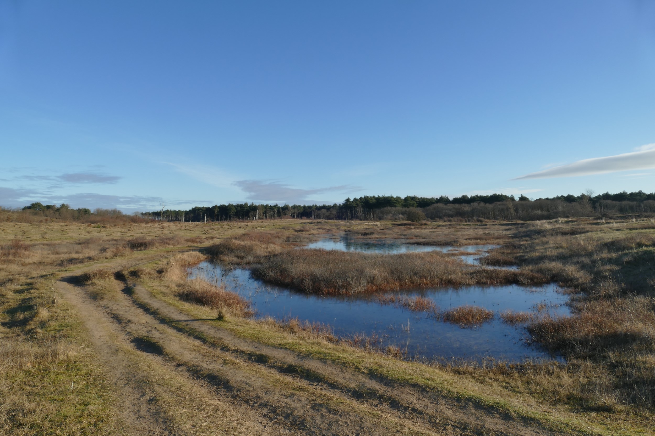 In het open deel van de duinen mag je niet fietsen op de paden en ik vind het daarom altijd fijn als we het Doornvlak oplopen. Je hoeft daar niet doorlopend achterom te kijken. De meertjes hier staan eindelijk weer vol water en liggen als blauwe parels in het bruine landschap…