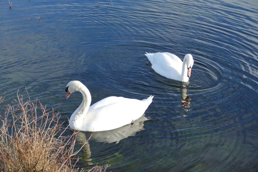 Terwijl we over het water staan uit te kijken, vliegen er twee zwanen over onze hoofden heen. Ze beschrijven een grote bocht en landen uiteindelijk weer op het water, vlakbij ons plekje.