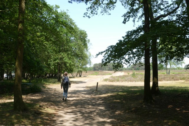 We parkeren op een beschaduwd plekje op de parkeerplaats. Restaurant: check! Klaphekje: check. Omheining: check! Schaapskooi: nou euh… het zal wel zeker!? We gaan op pad. Na een paar honderd meter hapert de routebeschrijving: er is sprake van een tweesprong, maar in realiteit hebben we hier echt wel keuze uit meer dan twee paden. Okay, we laten de ruiterpaden buiten beschouwing en nemen het pad dat naar een bosje loopt, zoals de routebeschrijving aangeeft. We volgen even later de bosrand (klopt) en moeten vervolgens door het bos en over een reep heide om de N527 over te steken. De beschrijving heeft het over paaltje nr. zoveel en paaltje nr. zoveel – er klopt weeral niks van…