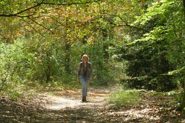 We lopen verder en zoeken onze weg door het bos. Hier en daar krijgt het bos al herfstige trekjes: met name de krentenboompjes zijn helemaal vergeeld en laten hun blaadjes al vallen…