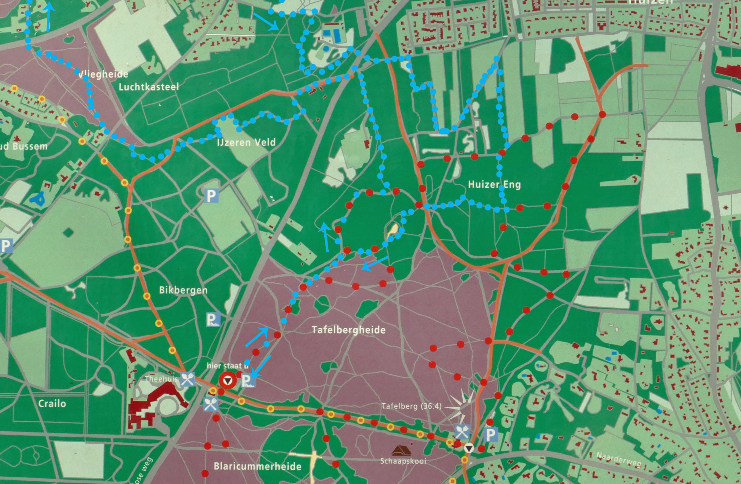 De blauwe stipjes geven de route aan die wij hebben gelopen. De andere stippen hebben niets te maken met onze wandeling: deze kaart is gefotografeerd op de parkeerplaats. Je ziet ook dat er een stuk mist van de door ons gelopen route…