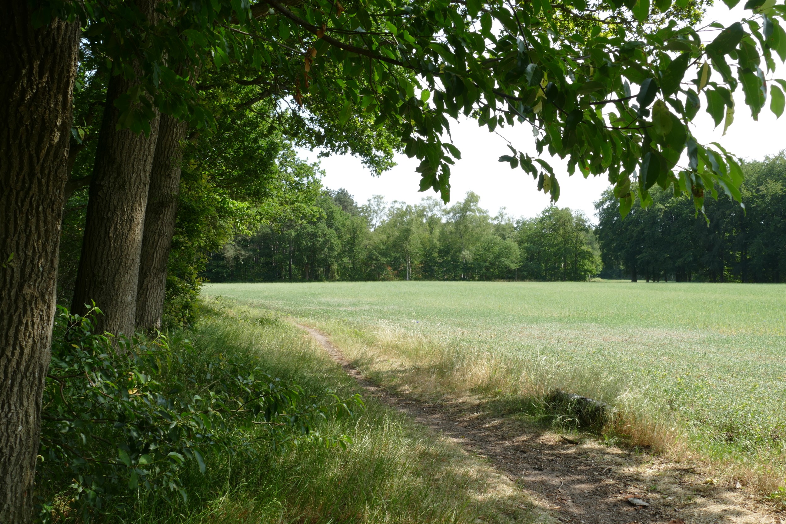 We staan dus vlakbij zwembad Sijsjesberg. Onze route komt hier ook voorbij. We volgen ze een stukje in tegenovergestelde richting en maken vervolgens gebruik van de inkorting, een doorsteek waarmee je de 15 km lange wandeling kunt inkorten tot 9 km. We komen bij een akkertje waar het jonge graan staat te verpieteren. De met wilde bloemen ingezaaide kruidenstrook staat er niet beter bij… De natuur lijdt onder de hitte en de droogte! Er staat een bankje, in de schaduw, en we zetten ons. Tijd om wat te drinken en iets te eten: wat nootjes en een haverreep met carrot cake smaak.