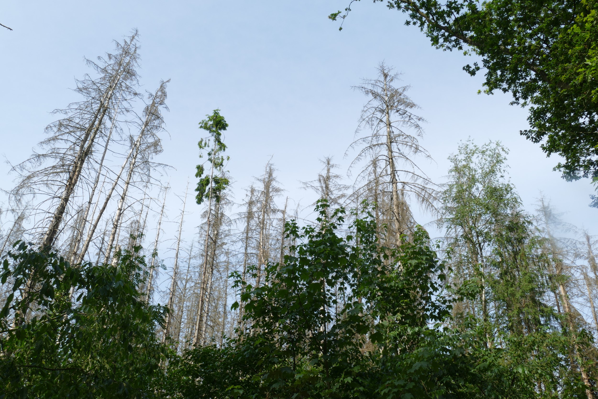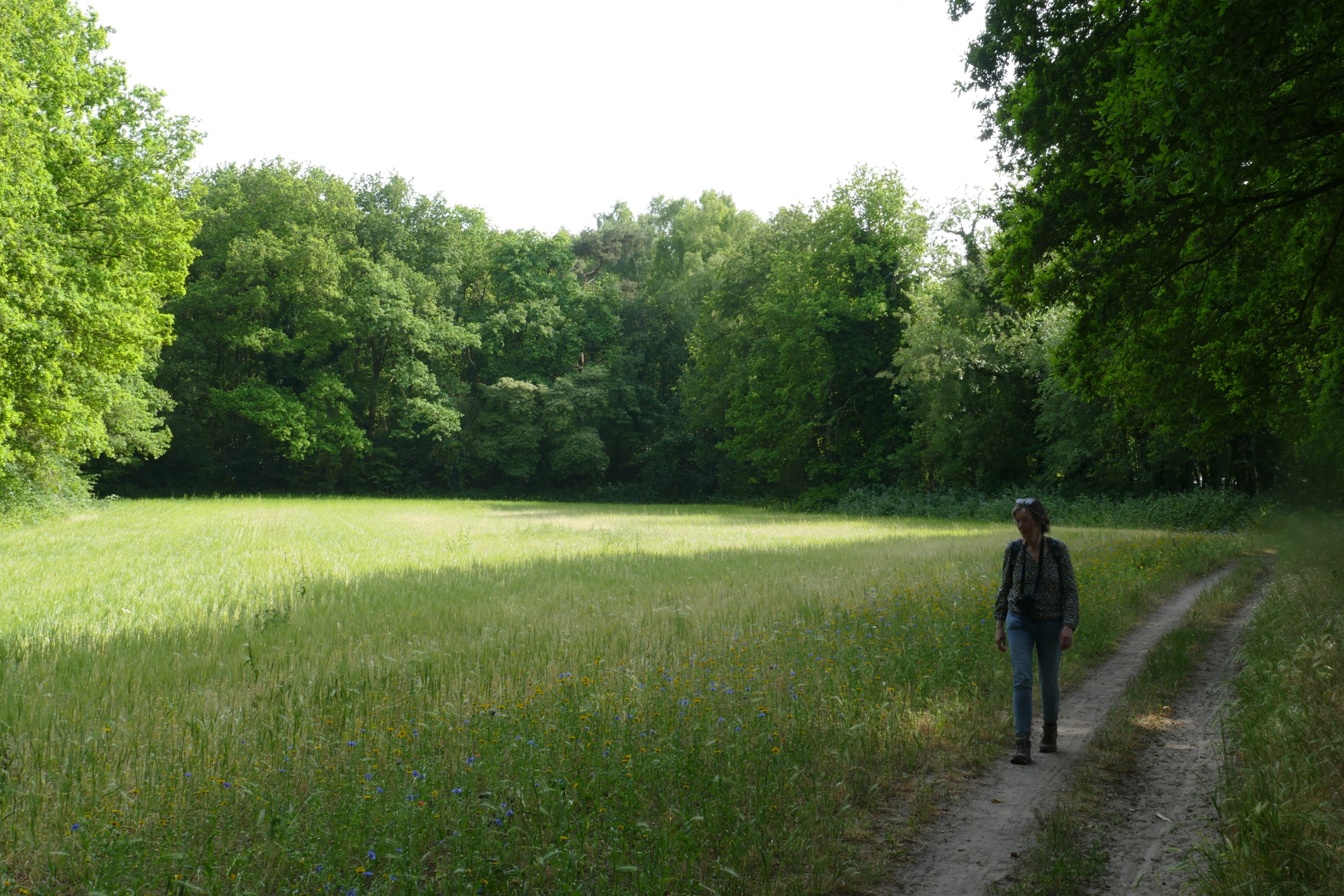 De route kronkelt verder, we moeten de beschrijving er echt goed bij houden, want om de haverklap sla je linksaf, rechtsaf; het ene paadje is nog smaller dan het andere… Dan staan we weer op dezelfde plek op de N527. We steken over en lopen verder. In het bos is een uitgestrekte natuurkampeerplaats waar de route omheen trekt. Af en toe komen we langs een akkertje maar meestens lopen we door bos. Veel loofbos (eik), maar ook dennen groeien hier – en sparren hébben hier gegroeid: de letterzetterkever heeft de sparren te grazen genomen!