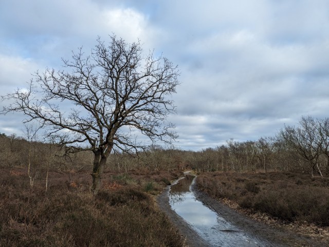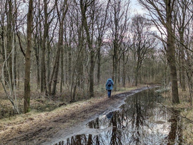 Als we het parkeerterrein bij De Franschman oprijden, zien we het meteen: een derde ervan staat blank en de bosjes die aan het parkeerterrein grenzen, zijn veranderd in meertjes… We lopen de Uilenvangerweg op en nemen het eerste pad naar links, richting Bergen aan Zee. Er komt een dame met een flinke rugzak op uit het pad. Ik vraag of het erg nat is, zij antwoordt dat het wel meevalt. Vind ik dat nou goed of slecht nieuws? Beide, geloof ik…