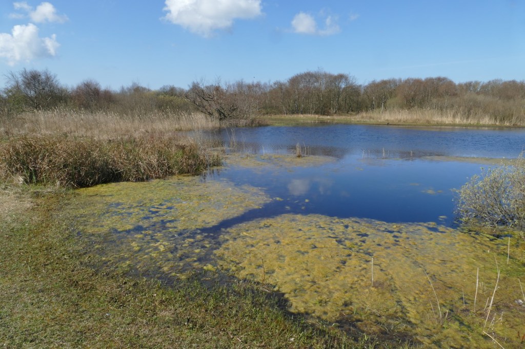 Op het water zien we eenden, ganzen en meerkoetjes, aan de kant staan reigers te vissen, we zien meeuwen, visdiefjes, scholeksters, grutto’s en kieviten vliegen, duiken en landen. Als we op een bankje zitten om even wat te eten en te drinken, rent er een haas langs.
