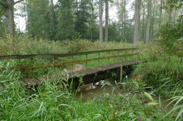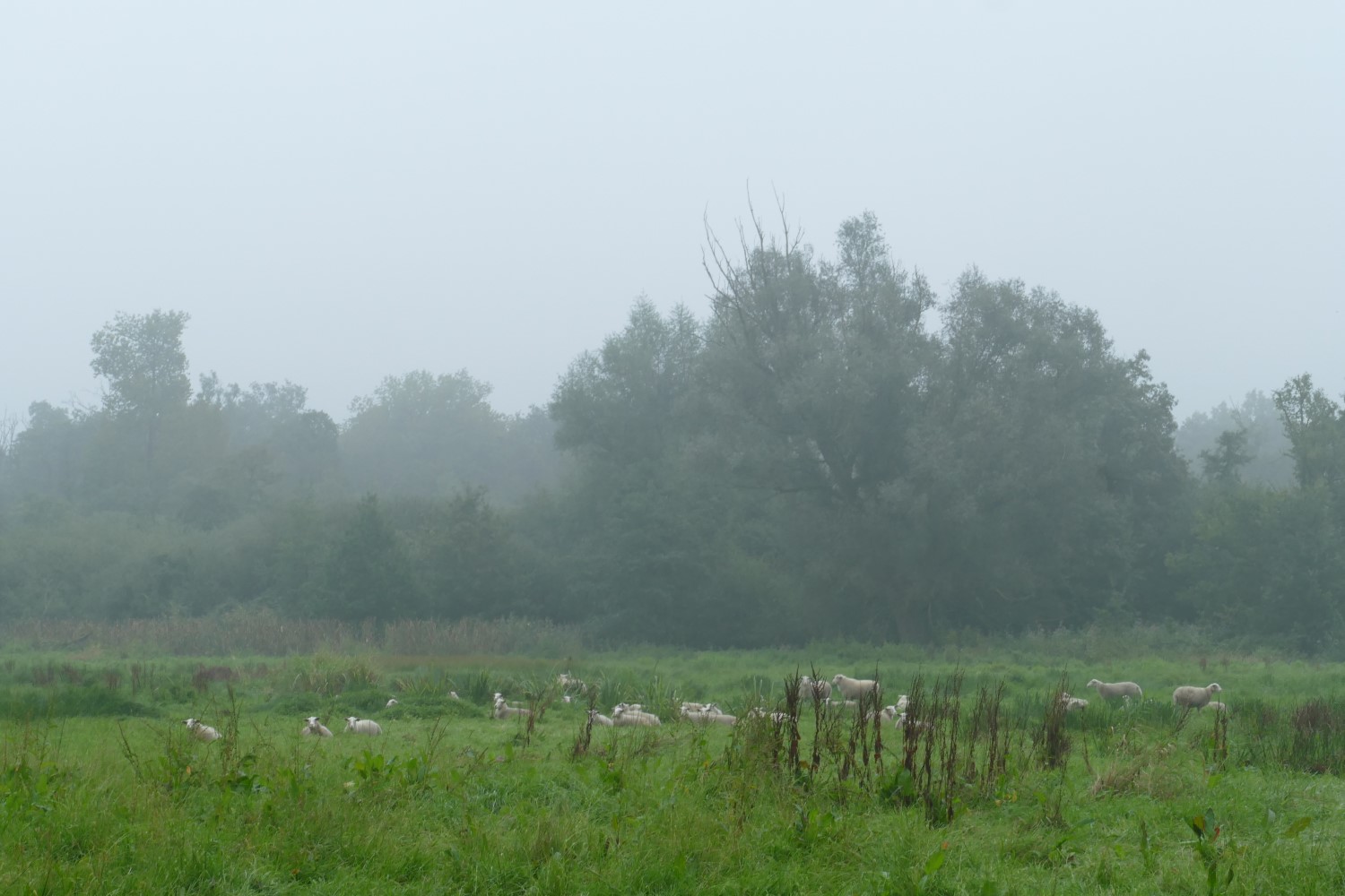Als we het parkeerterrein bij De Franschman oprijden, zien we het meteen: een derde ervan staat blank en de bosjes die aan het parkeerterrein grenzen, zijn veranderd in meertjes… We lopen de Uilenvangerweg op en nemen het eerste pad naar links, richting Bergen aan Zee. Er komt een dame met een flinke rugzak op uit het pad. Ik vraag of het erg nat is, zij antwoordt dat het wel meevalt. Vind ik dat nou goed of slecht nieuws? Beide, geloof ik…