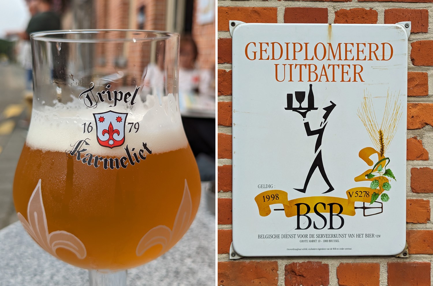 Wij kiezen voor een misschien wat minder inspirerende maar daarom niet minder aangename ambiance, namelijk die van het schaduwrijke terras. De tijd kabbelt daar in een gemoedelijk tempo en spijs en drank zijn voortreffelijk, evenals de vriendelijke bediening… Dit is zo’n plek waar je altijd terug naar toe wilt gaan. Maar helaas: in december worden de deuren gesloten en komt er een nieuwe eigenaar, en we moeten maar afwachten wat die ervan gaan maken… De Croque Vidé en de Corsendonk van ’t vat (6,3%) smaken uitstekend en vullen elkaar op prettige wijze aan…