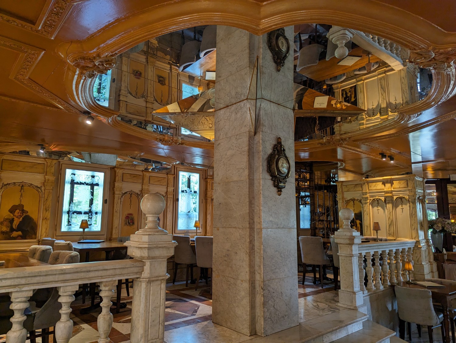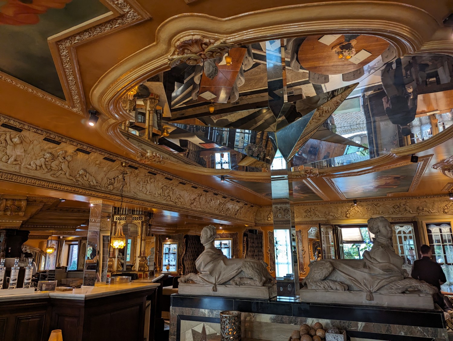 Twee uur later komen we terug bij het beginpunt van de wandeling. De deur van het Corsendonks Hof staat uitnodigend open en we lopen naar binnen. Ik kijk mijn ogen uit: zo’n café-interieur kom je maar zelden tegen; ik had wel een gezellige, bucolische atmosfeer verwacht, maar dit!?