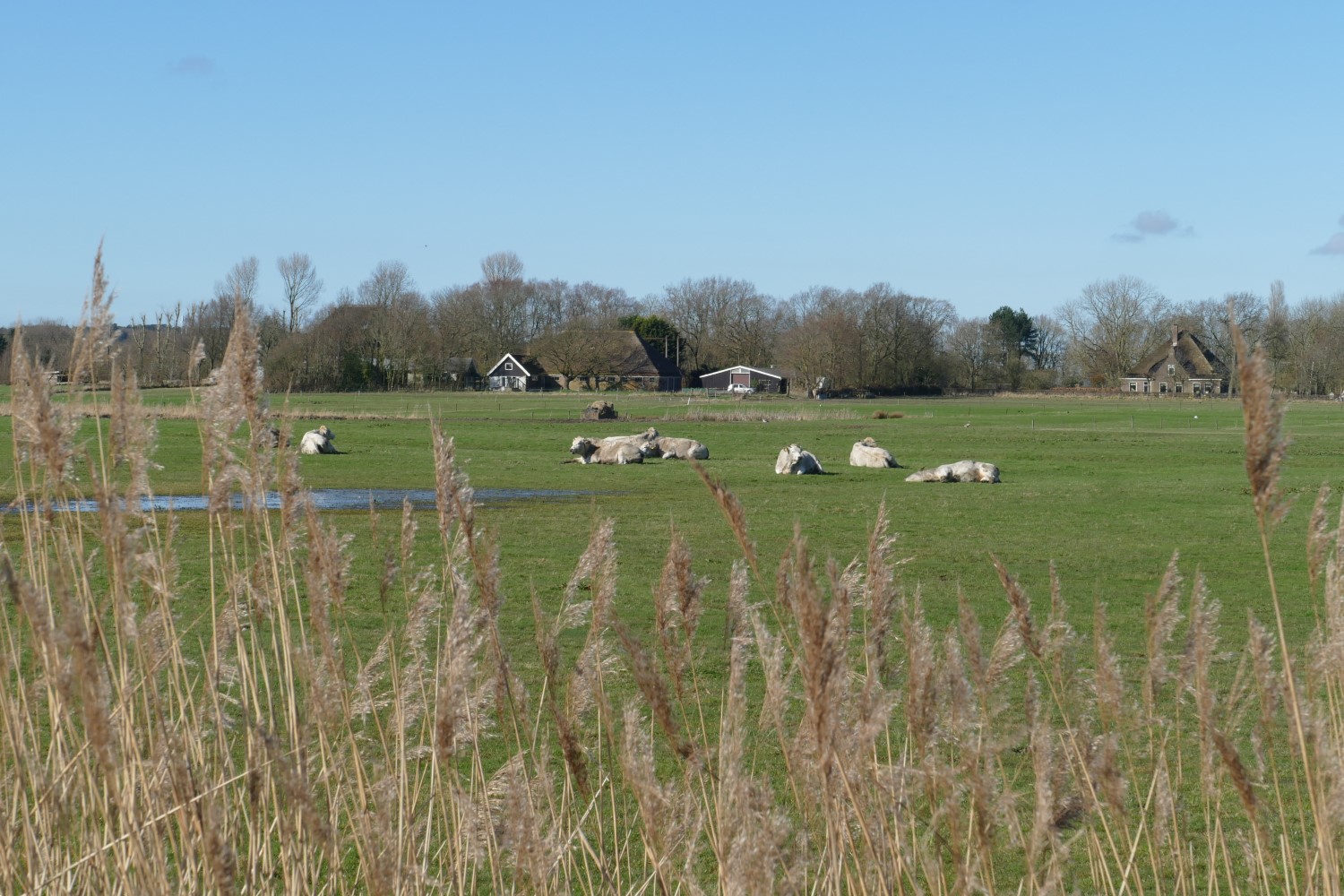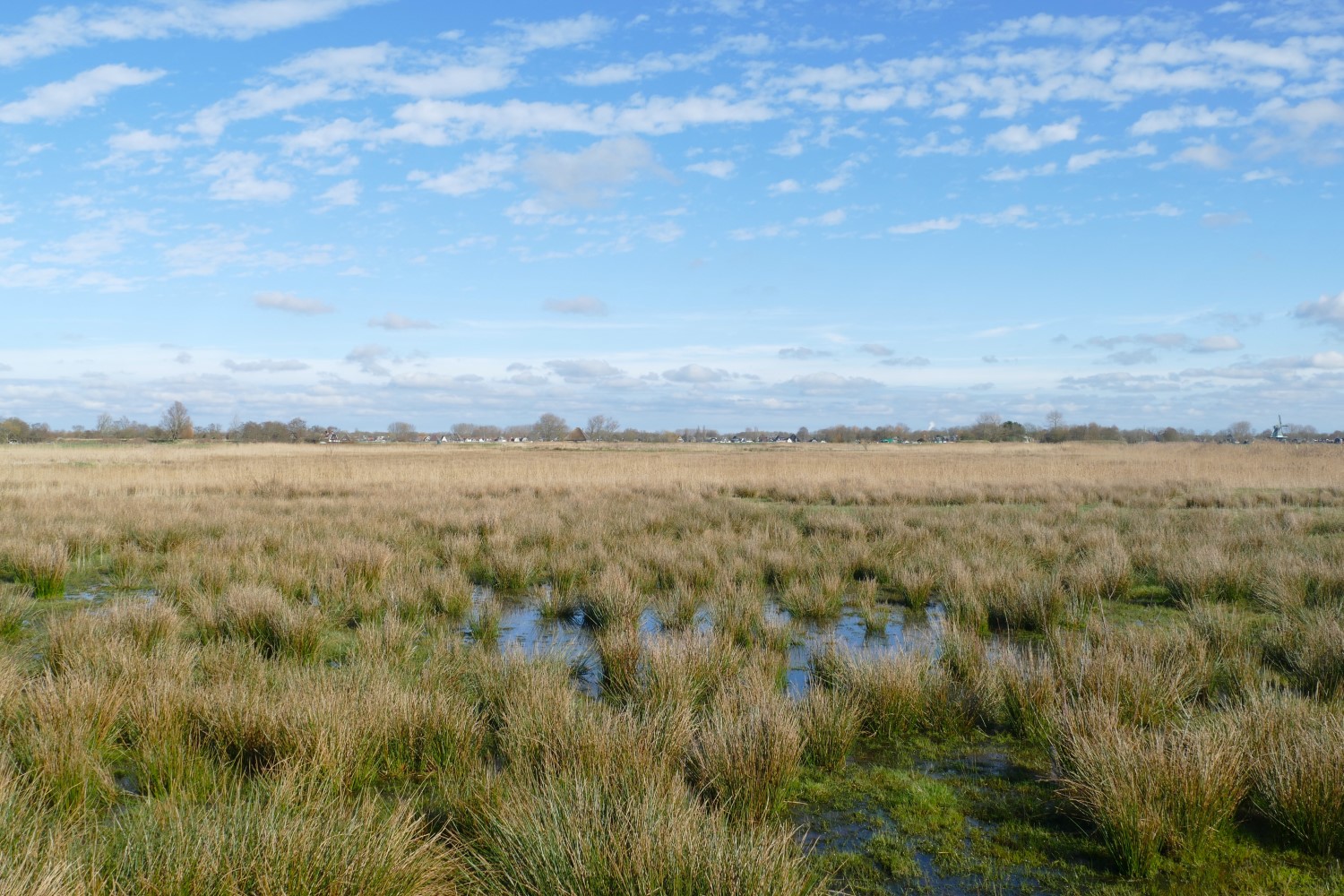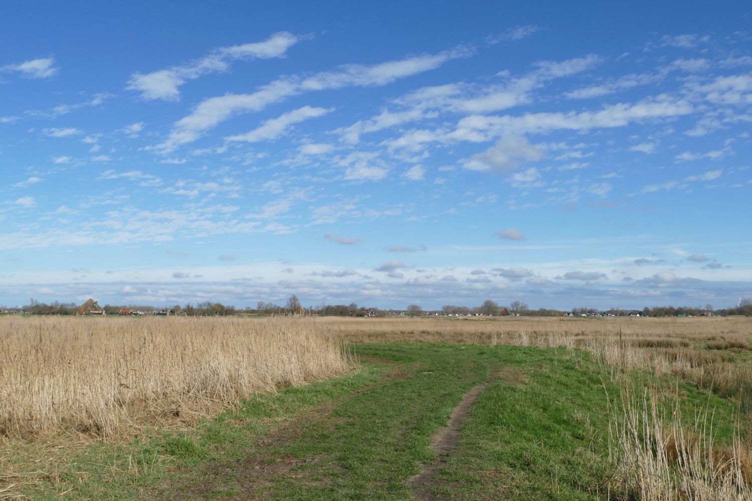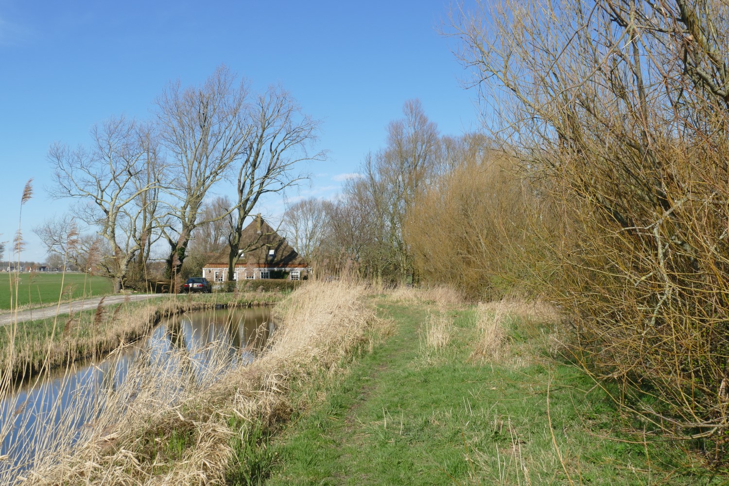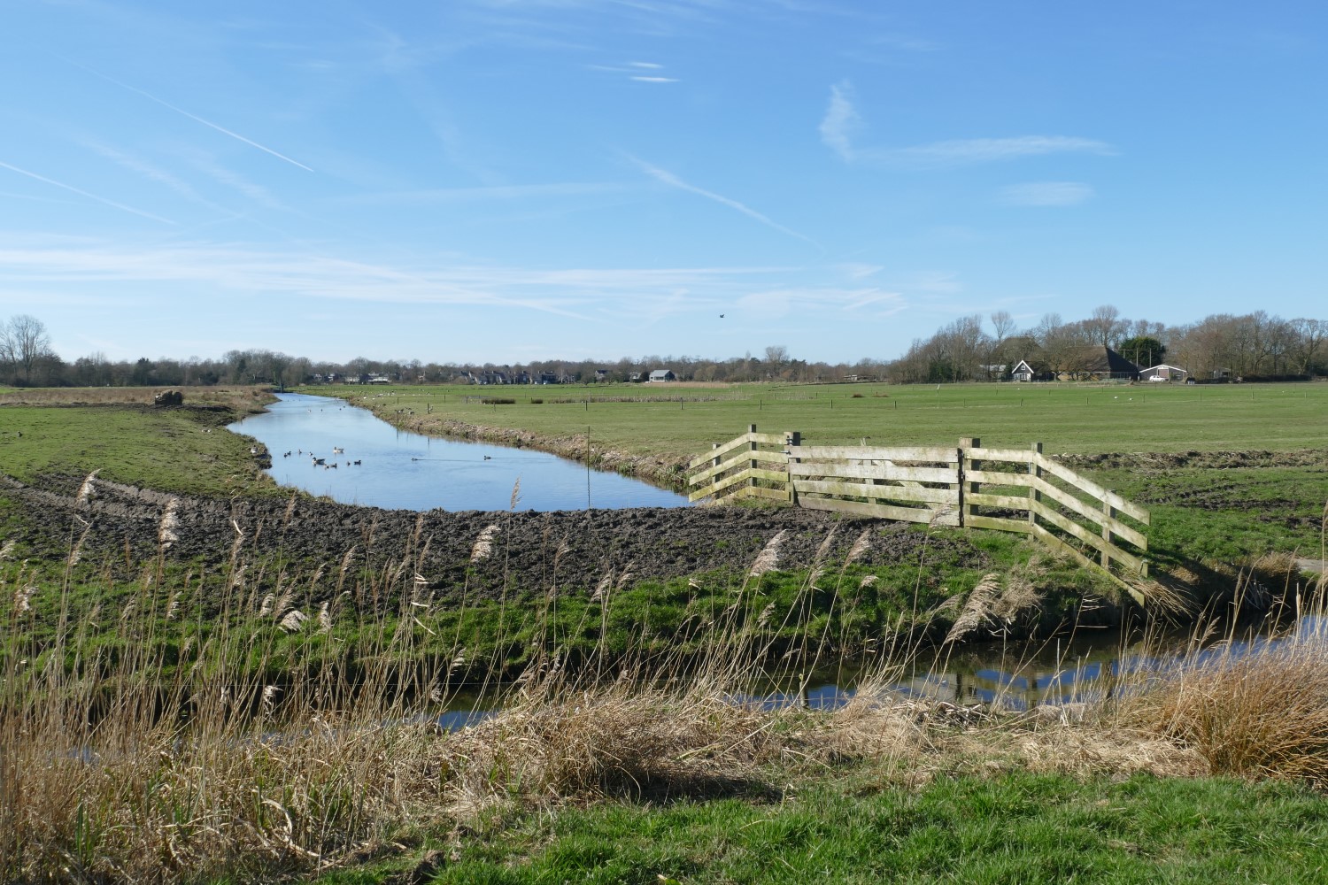 Net voor de Amara Hoeve verlaten we het asfalt en lopen we de Zuurvenspolder in: een waterberging en een mooi stukje poldernatuur waar je sinds een paar jaar over lage dijkjes kunt wandelen. Ook dit onverharde dijkje slingert zich door het polderlandschap. Heerlijk, gras onder de voeten!