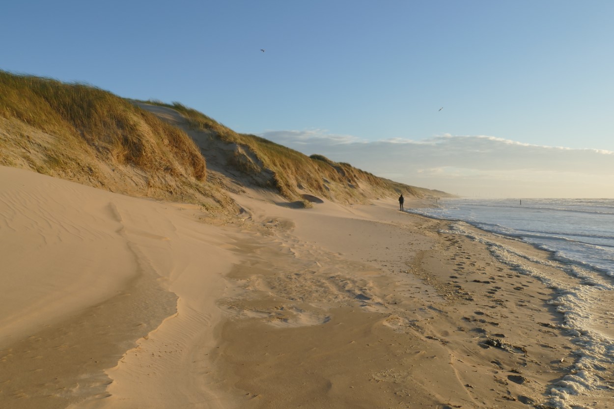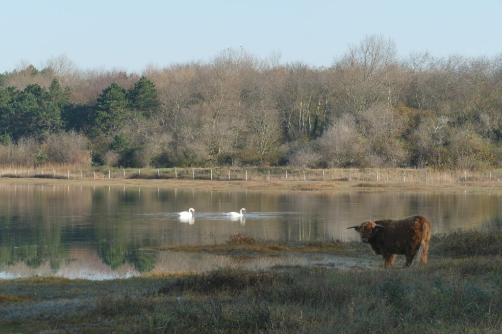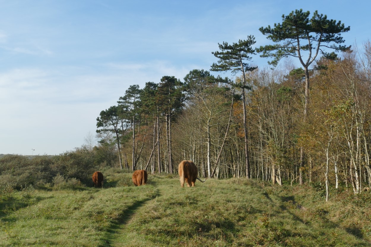 We laten het bos achter ons en betreden de openheid van het Doornvlak. Op het pad mag er niet gefietst worden en dat ervaren we als buitengewoon rustgevend. Her en der wordt de egaalblauwe lucht weerspiegeld in het oppervlak van een duinmeertje. Een reiger vliegt op, een zwerm spreeuwen dartelt langs. Is dat een groep koperwieken die daar wegvlucht? Op een wat groter duinmeer kun je uitkijken vanuit een vogelkijkhut. Er is niet zoveel te zien… enkel een paartje zwanen, dat aan het grondelen is en dus laten vader en moeder Zwaan meer hun kont dan hun snavel zien. Door het bos struint een familie Schotse hooglanders. De jongste telg van het gezin zoekt het duinmeer op om te drinken.