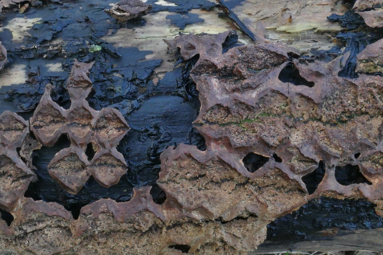 Op een van de smalle paadjes die aftakken van het hoofdpad, ligt een omgevallen boom met een bijzonder patroon in de schors. Het lijken wel honingraten. Even denk ik dat het toch zwammen zijn, maar als ik de ‘zwammen’ betast voelen ze echt wel houtig aan.