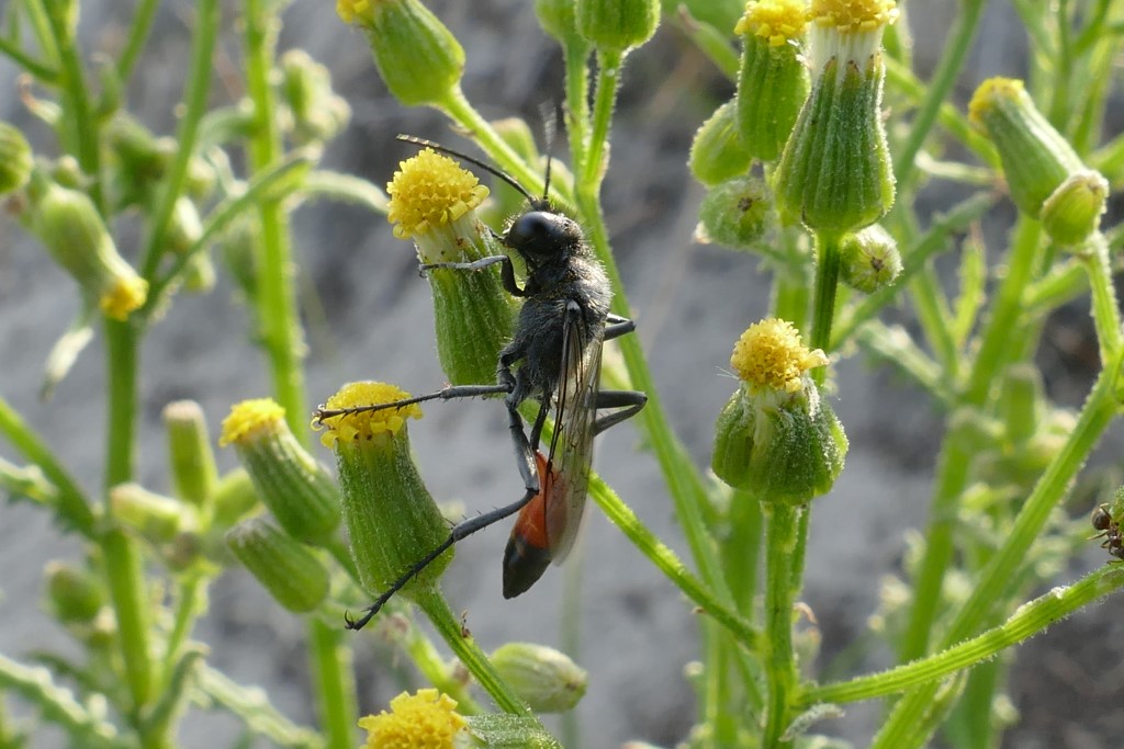 En dan vind ik op die onbekende plant nog een insect dat m.i. enige verwantschap vertoont met vampieren… Het zakje dat er onder dit beestje hangt, lijkt met bloed gevuld! Kenners mogen me laten weten om welk fascinerend diertje het hier gaat!