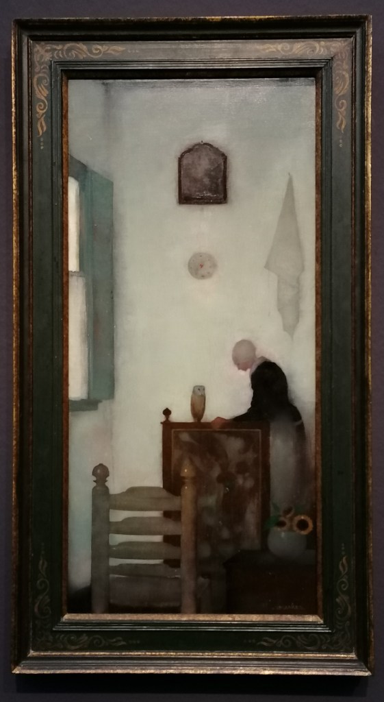 Tentoonstelling 1: Spiegel van de ziel (een thema waar ik me deze dagen nogal in verdiep…) – een aanrader! Bij Nederlandse kunst voor 1900, kom je al gauw uit bij namen als Breitner en Israels. Schilders die, in tegenstelling tot hun leermeesters, kozen voor een realistische weergave van het leven op het platteland of het drukke leven in de groeiende steden. Gelijktijdig en als reactie op de oppervlakkigheid van het moderne leven en de materiële welvaart, richtte een aantal kunstenaars zich op de intimiteit van de binnenwereld met thema’s als de besloten tuin, het interieur, het stilleven en de geesteswereld van de kunstenaar.