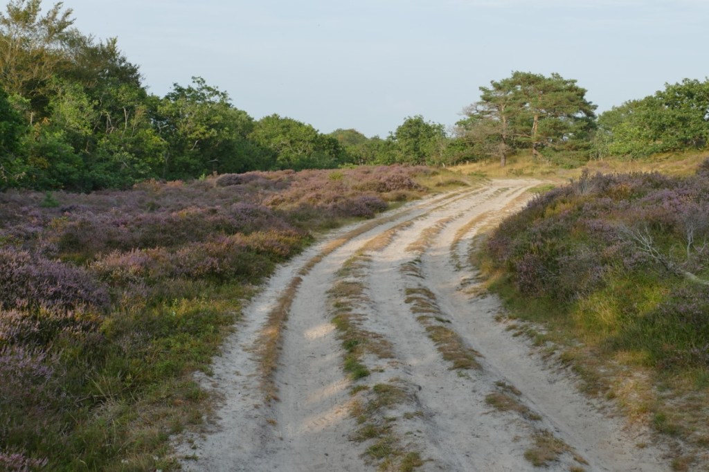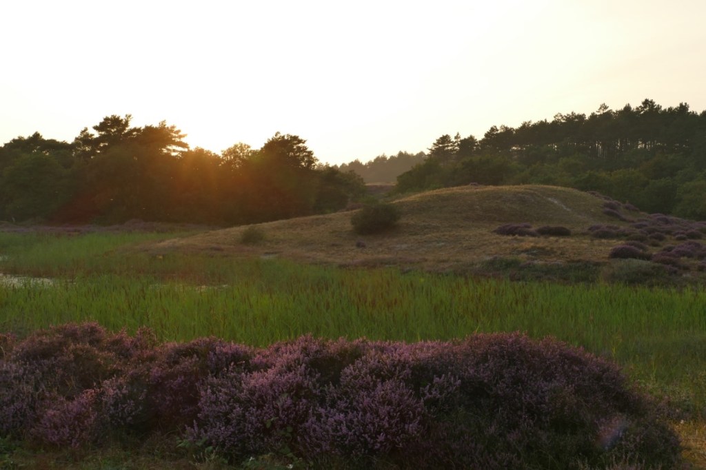 Aan het eind van de middag breekt de zon voorzichtig door, wat de temperatuur nog verder omhoog stuwt, maar in elk geval zorgt het zonnetje voor een vriendelijker uitstraling van de wereld! Dus stappen we tóch in de auto voor een rondje in de Bergense duinen en trotseren we de warme, vochtige lucht. We parkeren bij de Franschman, althans zo noemen wij die parkeerplaats omdat naast de nabijgelegen rotonde boerderij de Franschman staat. De naam van deze boerderij is afkomstig van het achtergelegen duin waar een Franse soldaat werd gevonden die in de slag bij Bergen in 1799 was gesneuveld.