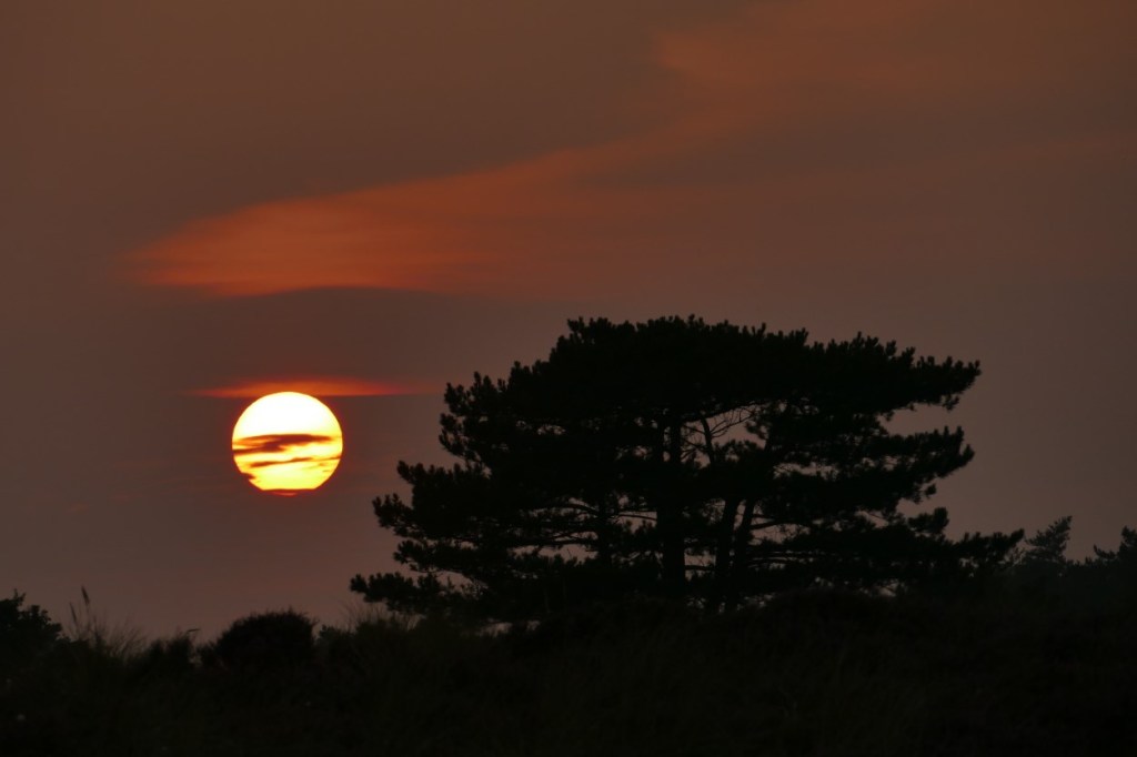 Achter ons gaat de zon onder roodgloeiend onder… Dat levert een Afrikaans aandoend tafereeltje op. Alleen het silhouet van een giraf ontbreekt maar dat kan ook kloppen, we lopen hier per slot van rekening gewoon in Nederland!