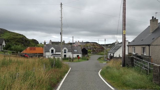 Ik ben vandaag zowaar in staat zelf sokken aan te trekken en de veters van mijn schoenen dicht te knopen! We lopen het dorp door in noordelijke richting. Mijn doel is een boerderij helemaal aan het eind van het dorp waar in 2015 nog een postkantoortje zat. De oude boer had in een ruimte naast zijn kantoor een weefgetouw staan waarmee hij gepatenteerde Harris tweed weefde. Ik ben benieuwd of het er allemaal nog is. Vrouwlief zal eerder een zijpad nemen en naar Carloway wandelen…