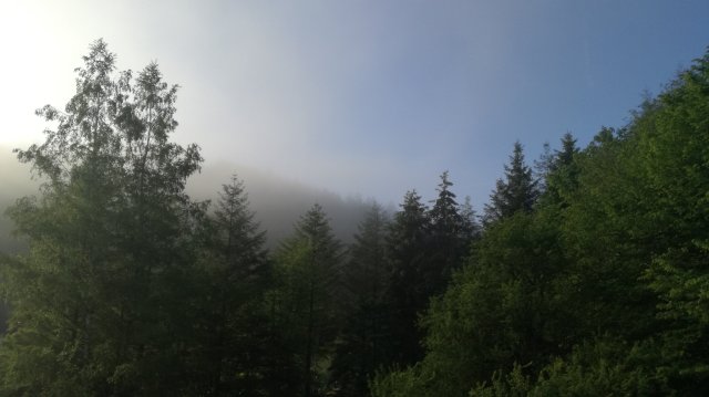 Als ik om iets over zevenen de rolluiken omhoog hijs, tuimelt helder zonlicht de slaapkamer binnen; vanuit het dal stijgen nevelslierten omhoog… We rijden gauw naar Daleiden, naar het supermarktje-cum-bakkerij , om allerlei lekkers in te slaan. We ontbijten met broodjes, zuurdesembrood, kaas, bosbessenjam, appelstroop (van de abdij van Valdieu) en een grote pot thee. De rugzakken worden klaargemaakt en we rijden naar Irhausen waar we aan de wandeling beginnen.