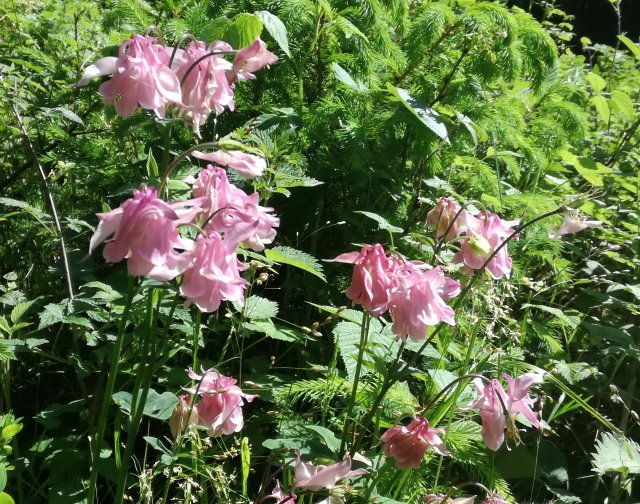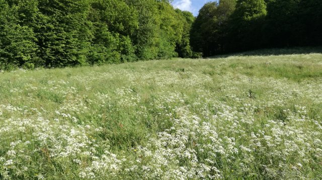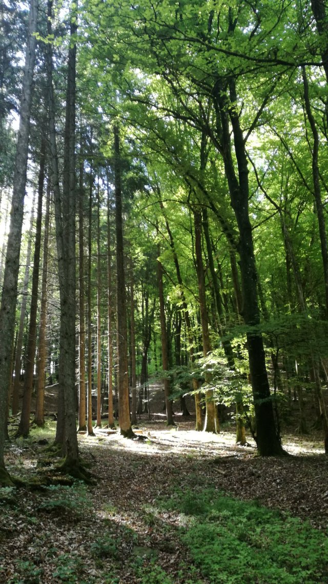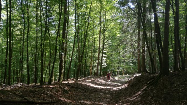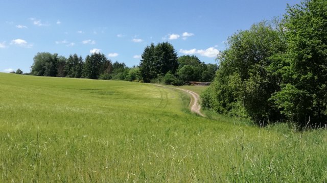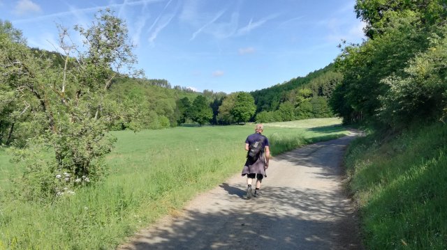 De zon schijnt uitbundig maar al redelijk snel doemen de eerste wolken op. We lopen een stukje langs de Irsen en nemen dan het pad dat door het dal van de Eschbach omhoog voert naar het dorpje Eschfeld. Tussen de bomen door zie ik een grote vogel opvliegen: zwart, rode poten en rode snavel. Een zwarte ooievaar! Wow, dat is best bijzonder!
