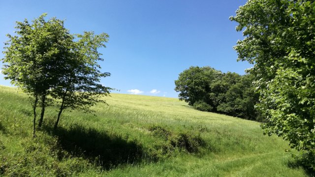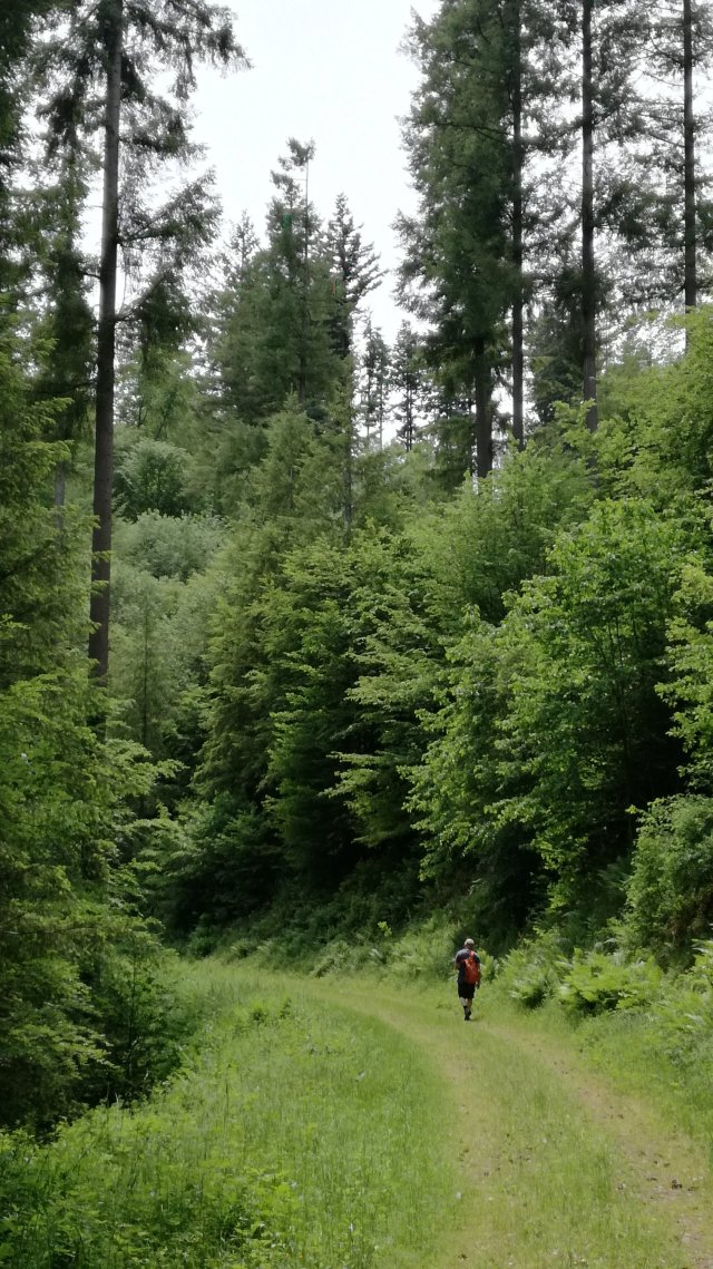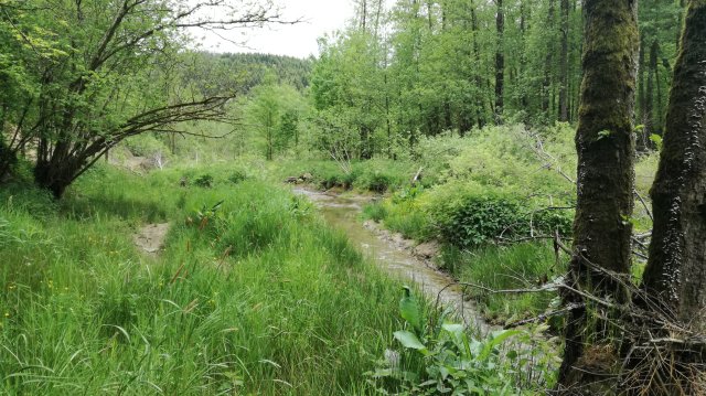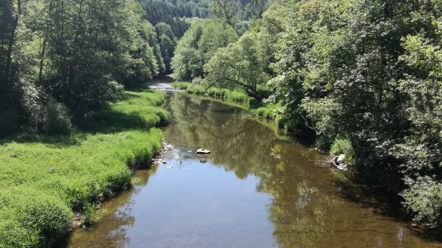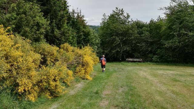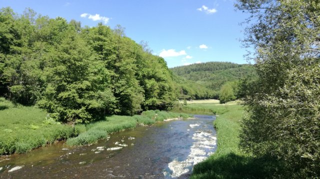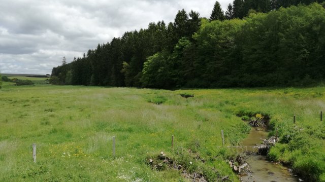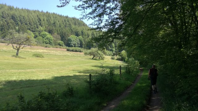 We volgen nu een stukje de ‘grote weg’ naar Roscheid, genietend van weidse uitzichten, en dalen voorbij het dorp over een steil pad af naar de Irsen. Hoog in de lucht cirkelt een koppel wouwen, goed herkenbaar aan hun gevorkte staart. Een ree wordt opgeschrikt en verdwijnt in de bossages langs het pad… Op de brug over de Irsen, die hier nog slechts een kronkelende beek is, eten we de meegebrachte lunch op.
