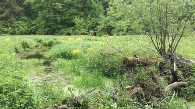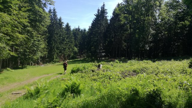 Het pad door het Irsental heb ik vaak gelopen, het is een heerlijk pad. Wás, moet ik helaas zeggen… Er wordt hard gewerkt aan de verbreding ervan! Het contrast tussen de nieuwe weg en de Irsen, die rustig meandert door smalle, malse weilanden vol boterbloemen en hier en daar door een moerasbosje, is enorm. We lopen als het ware over een litteken in het landschap… Slechts af en toe heeft het pad zijn oude karakter behouden – voor hoe lang nog!?