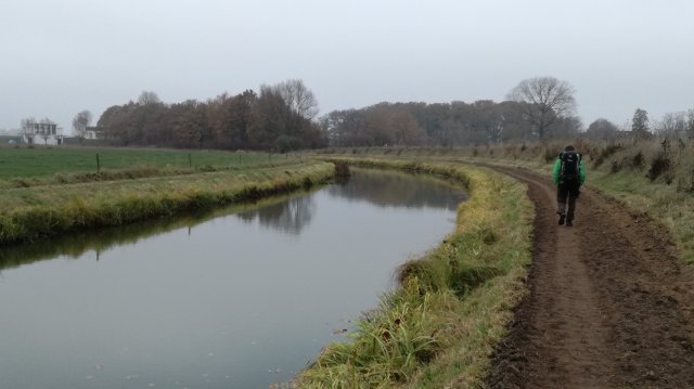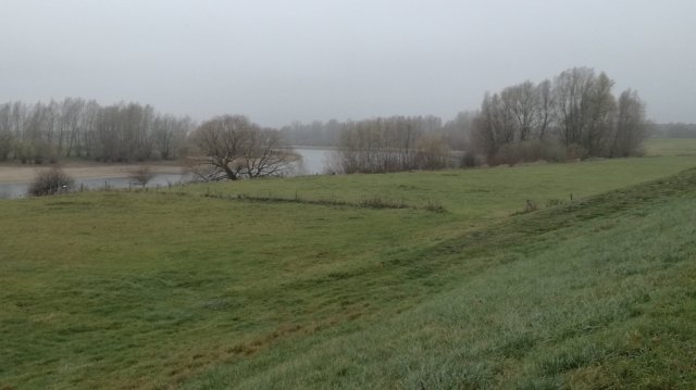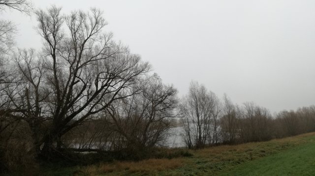 We lopen Doesburg uit en belanden op de dijk langs Het Zwarte Schaar, een oude, afgesneden IJsselarm. Het is kil en grijs weer, er staat een zacht maar zuur windje, handschoenen zijn geen overbodige luxe.
