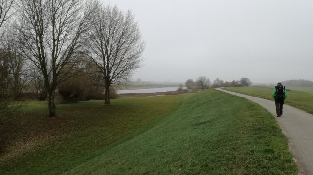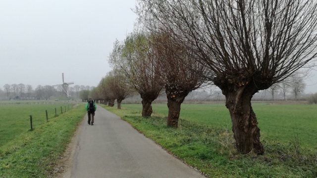 Eerst loopt het fietspad aan de voet van de dijk en lopen wij op de grassige kruin. Dat feest duurt niet lang want algauw komt het fietspad bovenop de dijk lopen. Ruim 12 kilometer asfalt hebben we nu voor de boeg! Wederom schieten alle vooroordelen over wandelen in Nederland door mijn hoofd. Gelukkig er af en toe ook onderaan de dijk lopen, op een graspad.