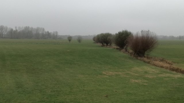 De weilanden zitten vol grote groepen ganzen die geregeld opvliegen en over ons heen wieken.