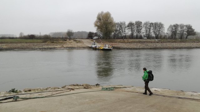 Vanaf Bronkhorst lopen we over een asfalt weg naar de IJssel. Het pontje doet het, gelukkig. De veerman zit te slapen in zijn cabine, ik roep over het water en zie hem in beweging komen. Het pontje komt onze kant uit.