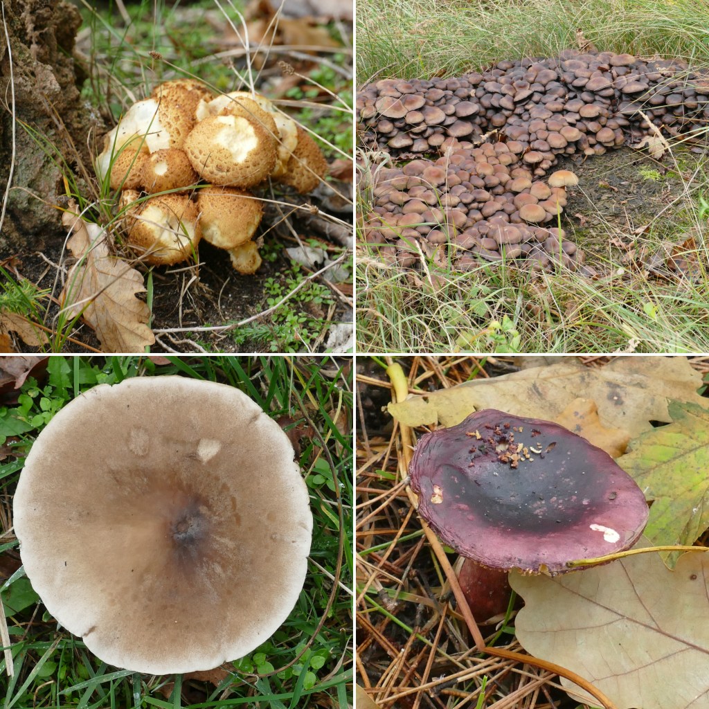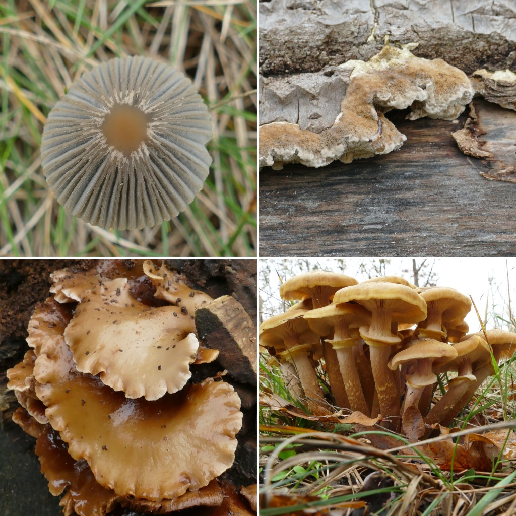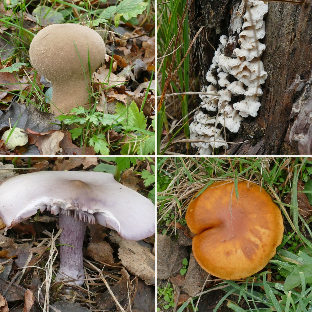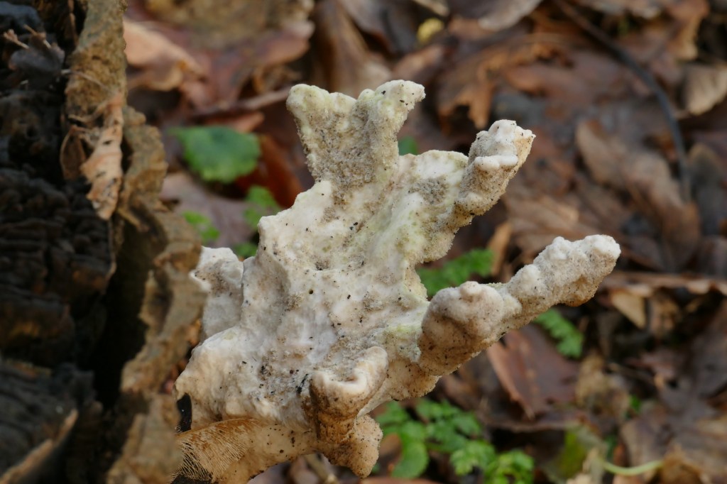Net voor we de Hogeweg inslaan, zien we links een afgezaagde boomstronk met daarop een grote, witte zwam. Wat we ook proberen, ObsIdentify (app op onze telefoons waarmee je planten, insecten, paddenstoelen enz. kunt determineren) herkent de zwam niet…