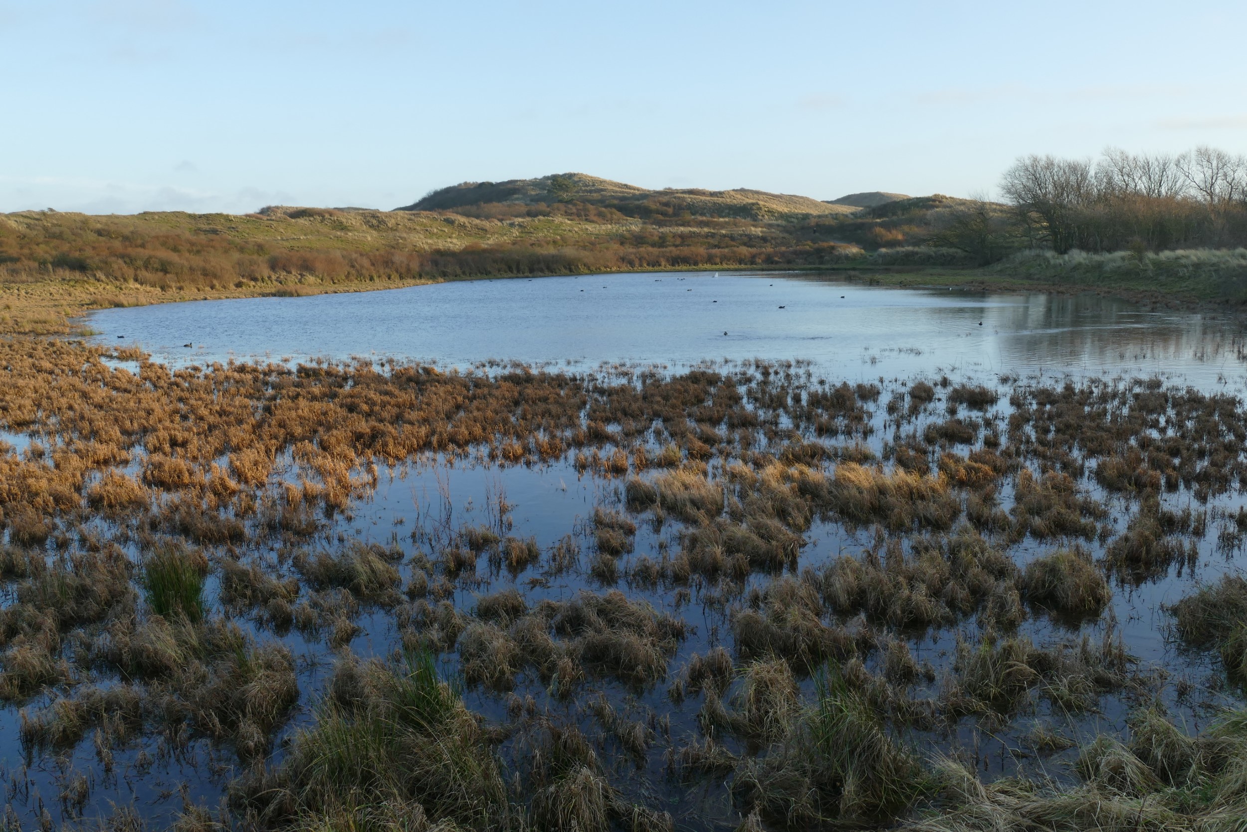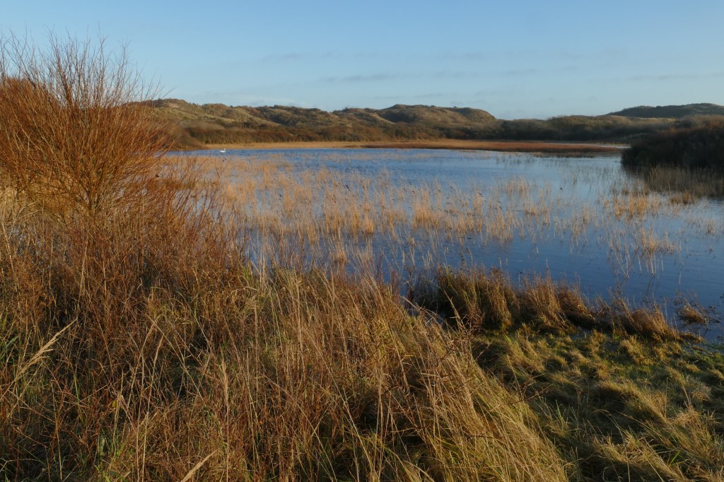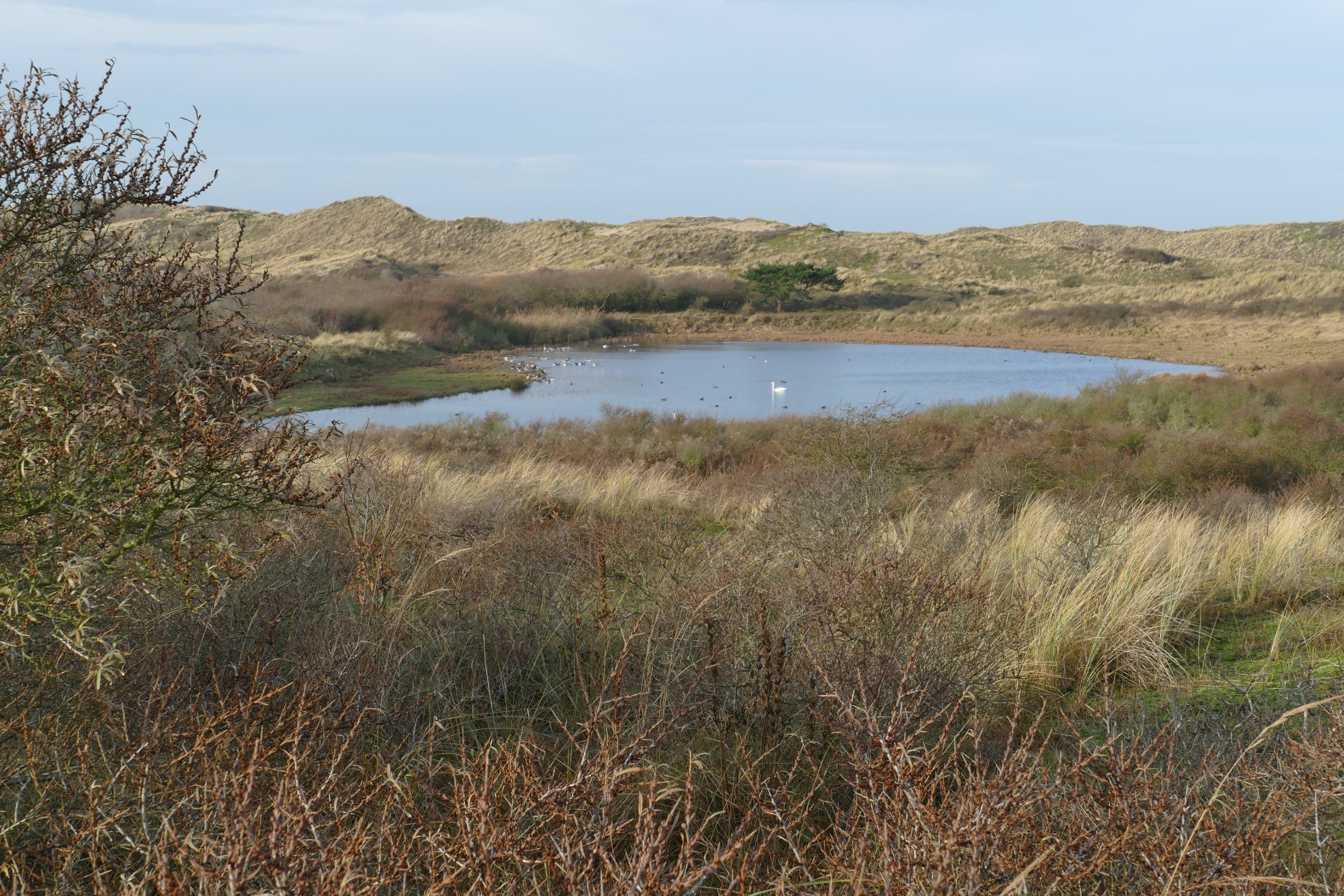 We lopen hand in hand verder en komen bij een duinmeertje. Er grondelt een koppel zwanen, er zwemt een dozijn meerkoetjes rond en tegen de oevers aan heeft zich een forse groep gakkende ganzen verzameld. Zo druk is het hier zelden!