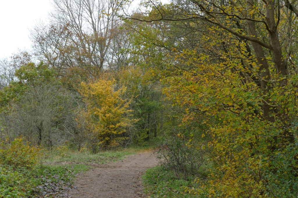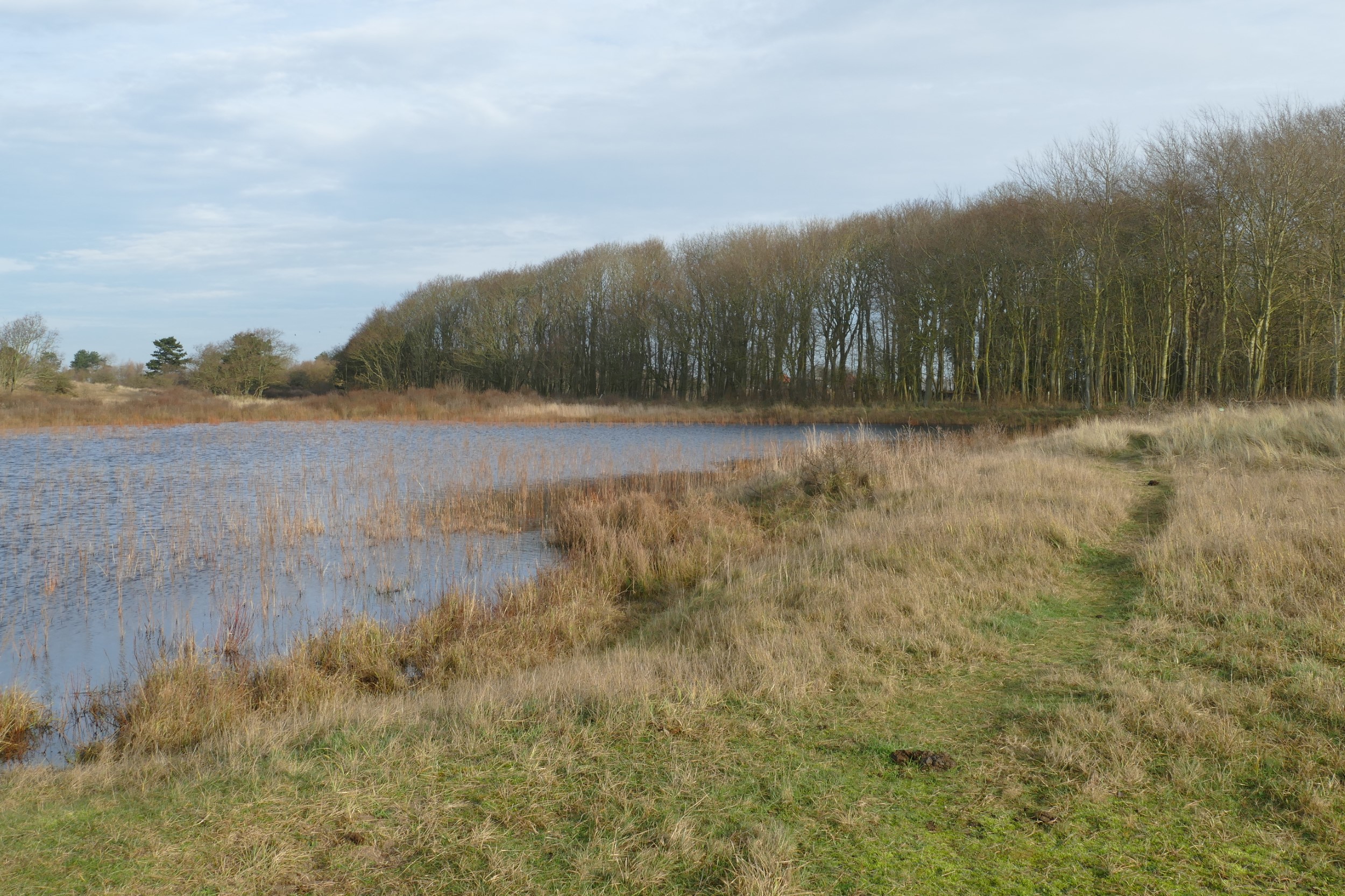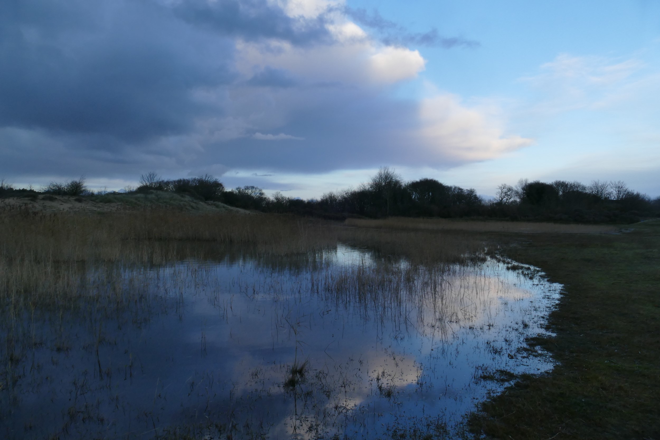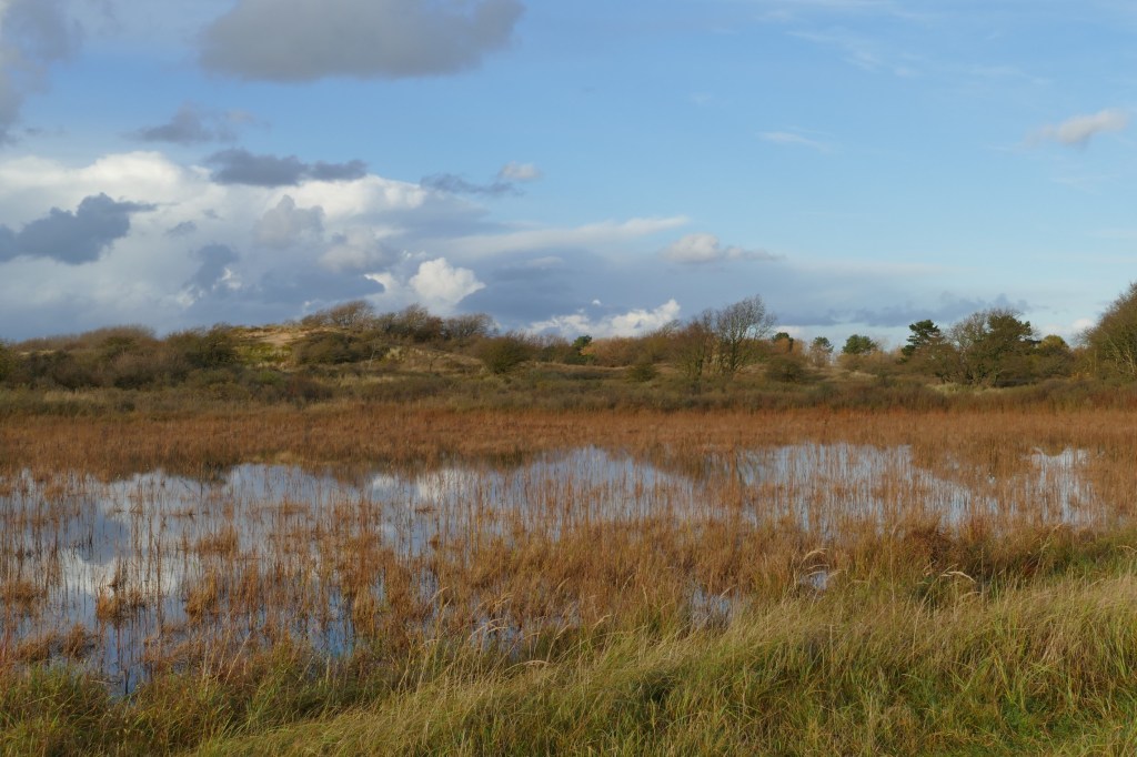 We lopen hand in hand verder en komen bij een duinmeertje. Er grondelt een koppel zwanen, er zwemt een dozijn meerkoetjes rond en tegen de oevers aan heeft zich een forse groep gakkende ganzen verzameld. Zo druk is het hier zelden!