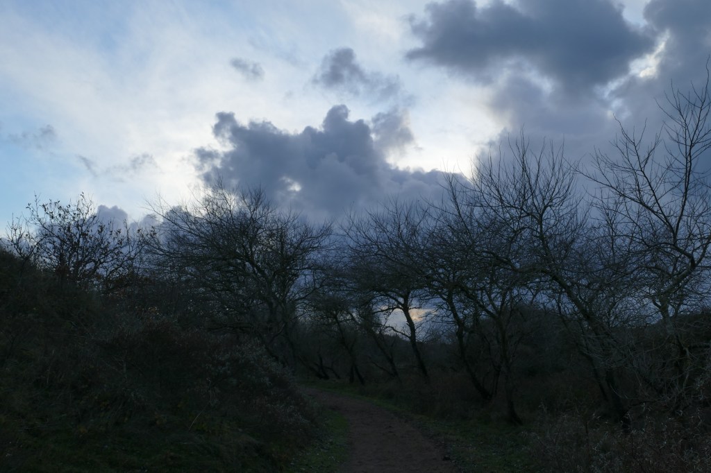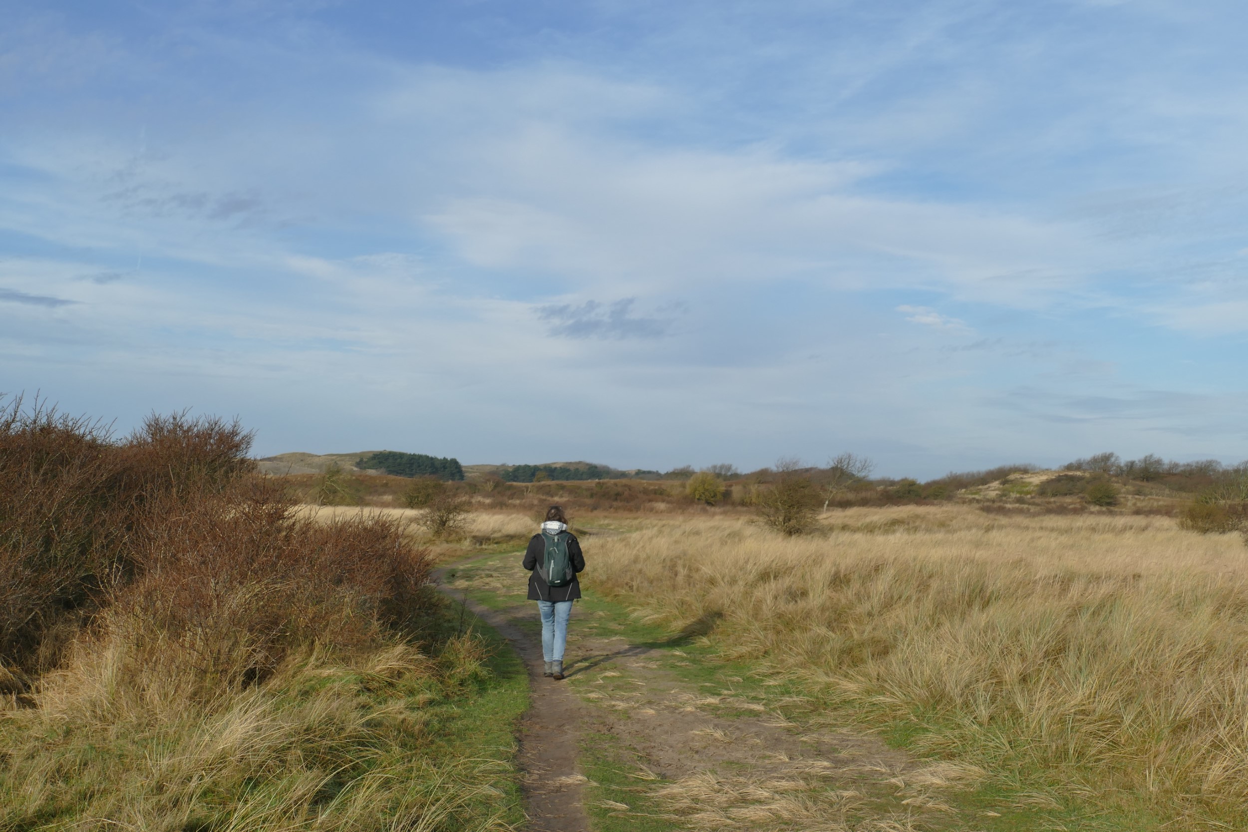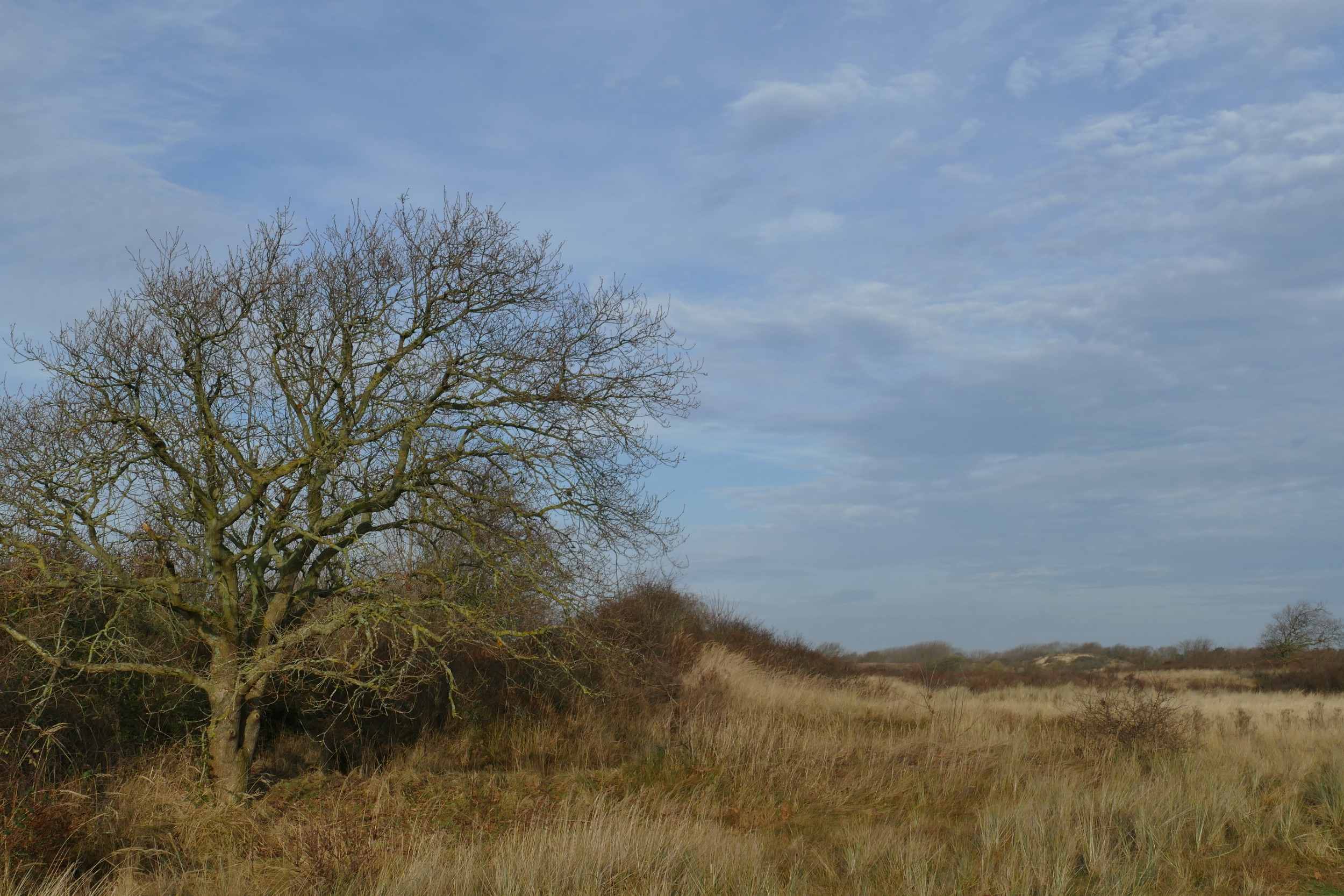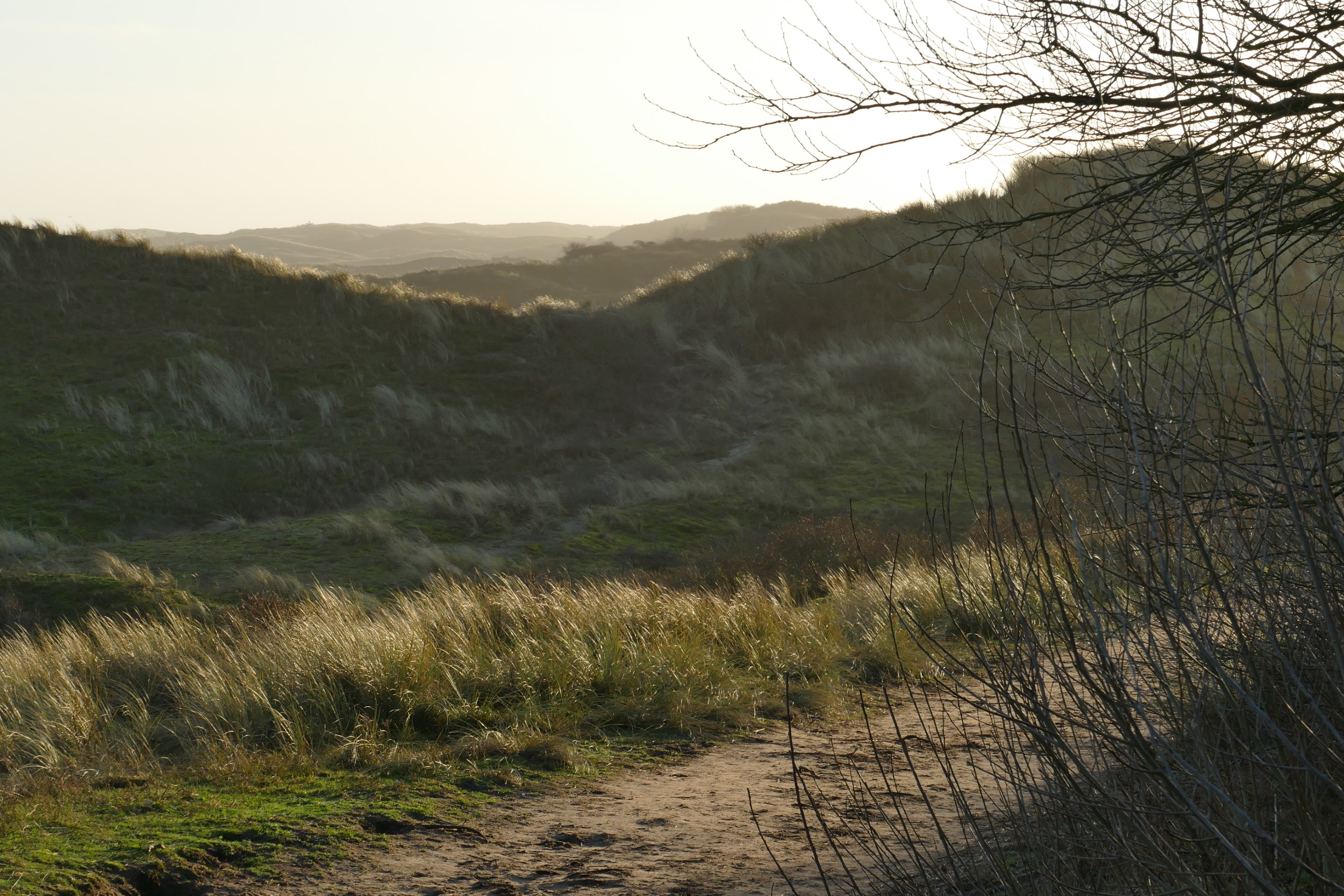 We zijn niet de enige wandelaars en dat is begrijpelijk: december eindigde vooral in sombere grijstinten en dan is een mens blij als de zon er nog even doorkomt! Vrouwlief en ik genieten… Door de lage stand van de zon strijkt het licht mooi over het duinlandschap…