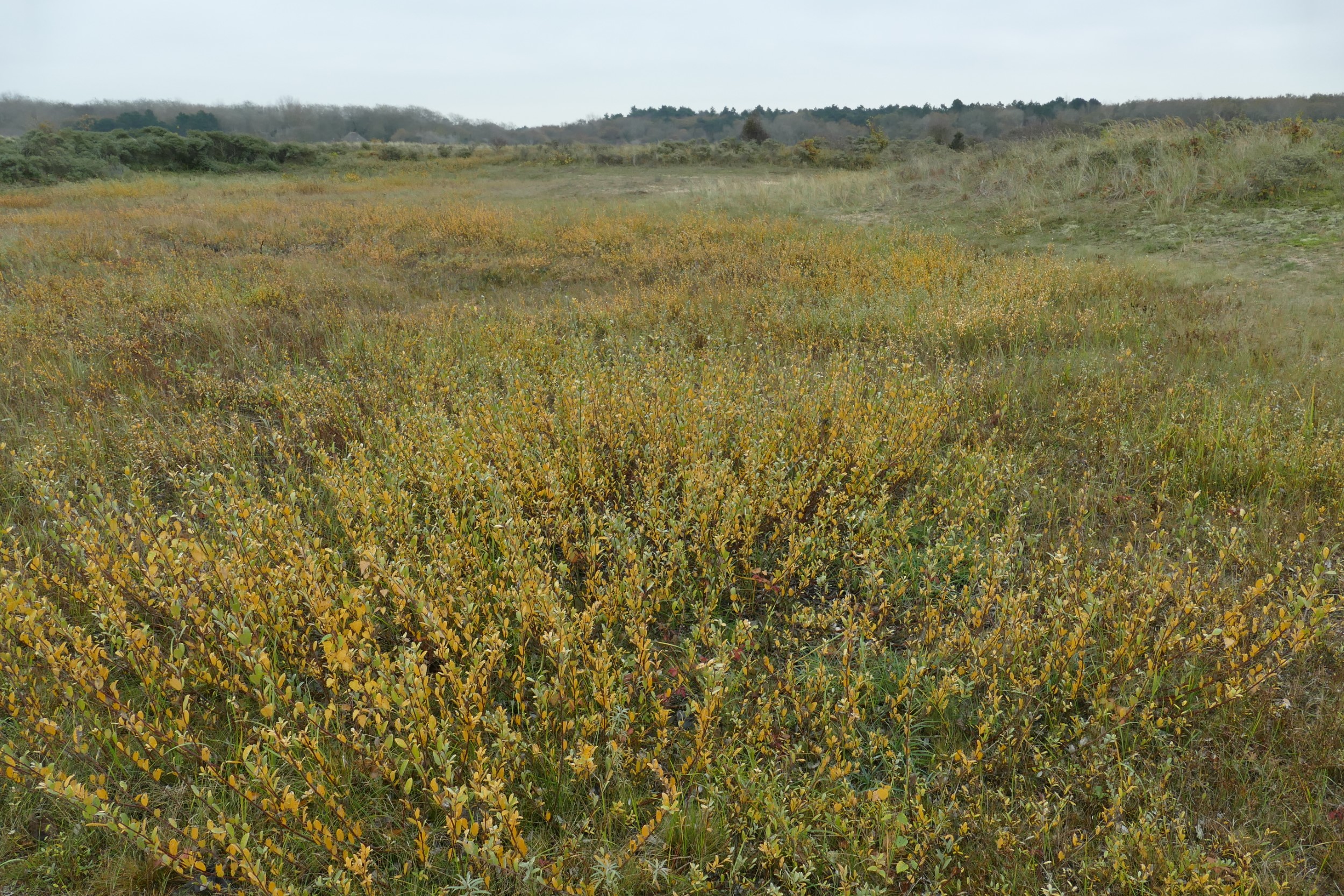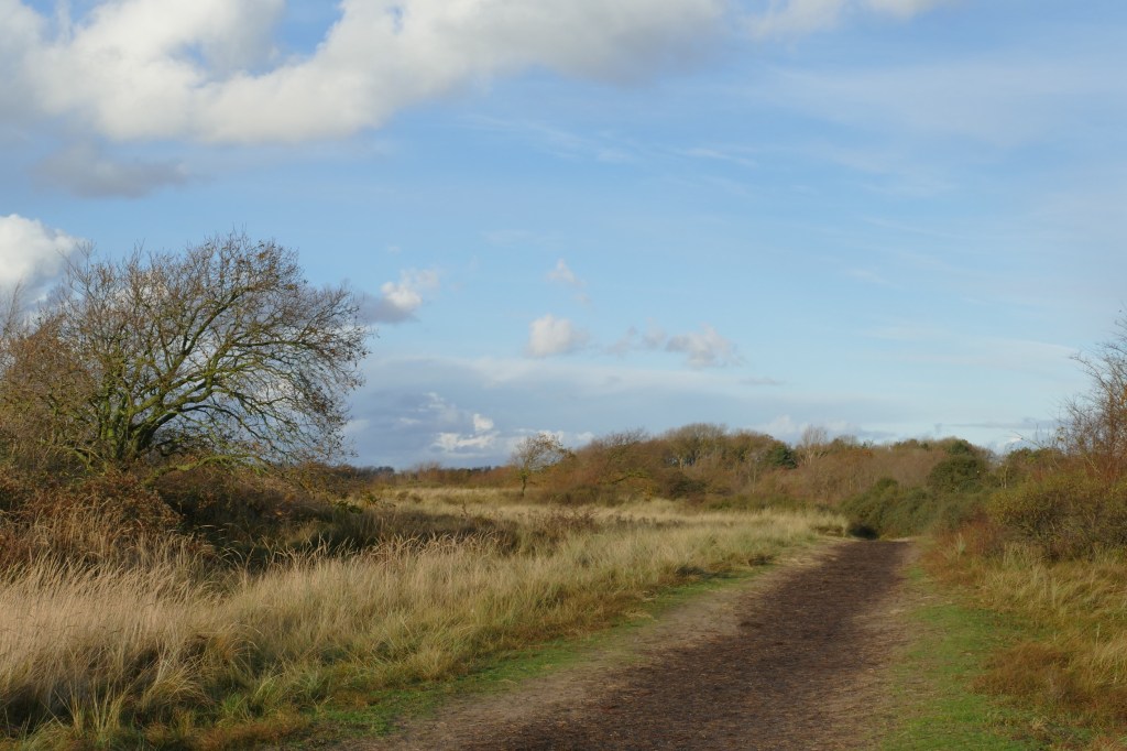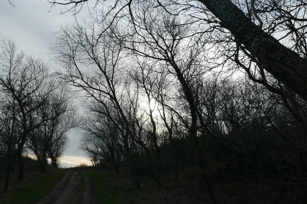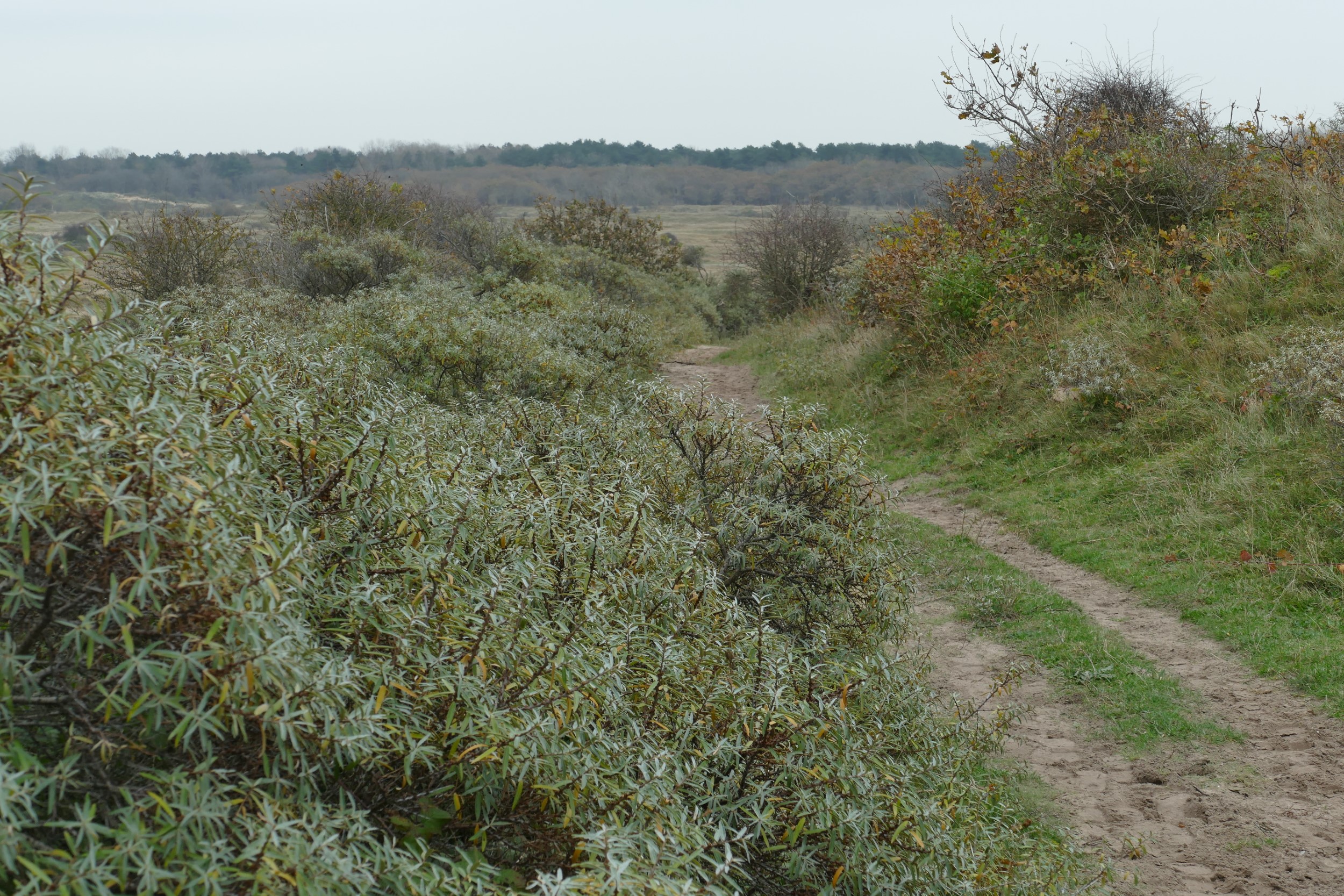 We zijn niet de enige wandelaars en dat is begrijpelijk: december eindigde vooral in sombere grijstinten en dan is een mens blij als de zon er nog even doorkomt! Vrouwlief en ik genieten… Door de lage stand van de zon strijkt het licht mooi over het duinlandschap…
