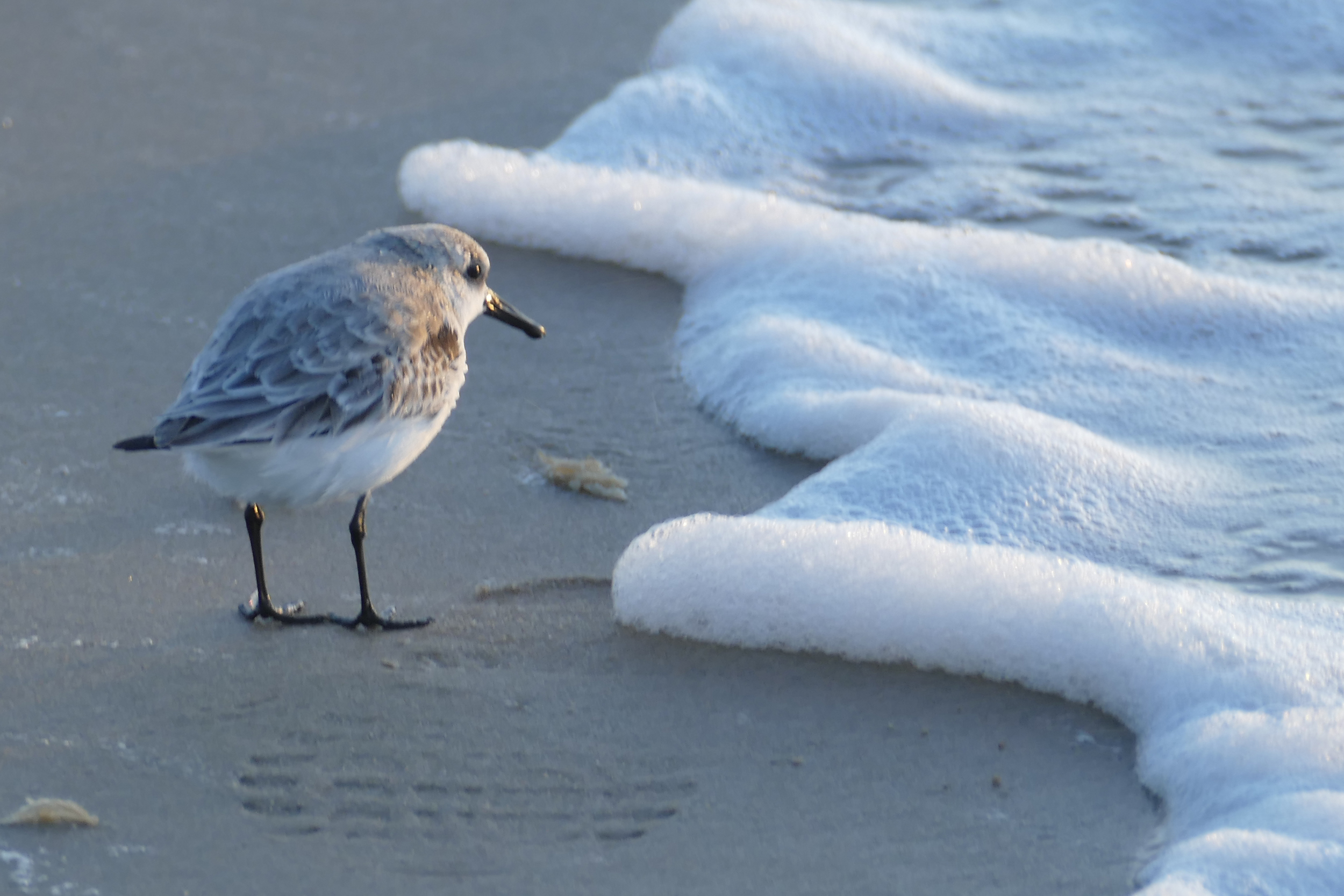 Vanuit het westen nadert een dun wolkenveld waarachter de zon deels verdwijnt… Het licht wordt zacht. Behalve veel mensen, velen vergezeld van hun viervoetige huisgenoten, rennen er hier en daar eenzame strandlopertjes op en neer, met de branding mee. Wat een leuke vogeltjes zijn dat toch. Meestal zie je ze in groepjes, maar vandaag merken we enkel een paar individuele vogels op.