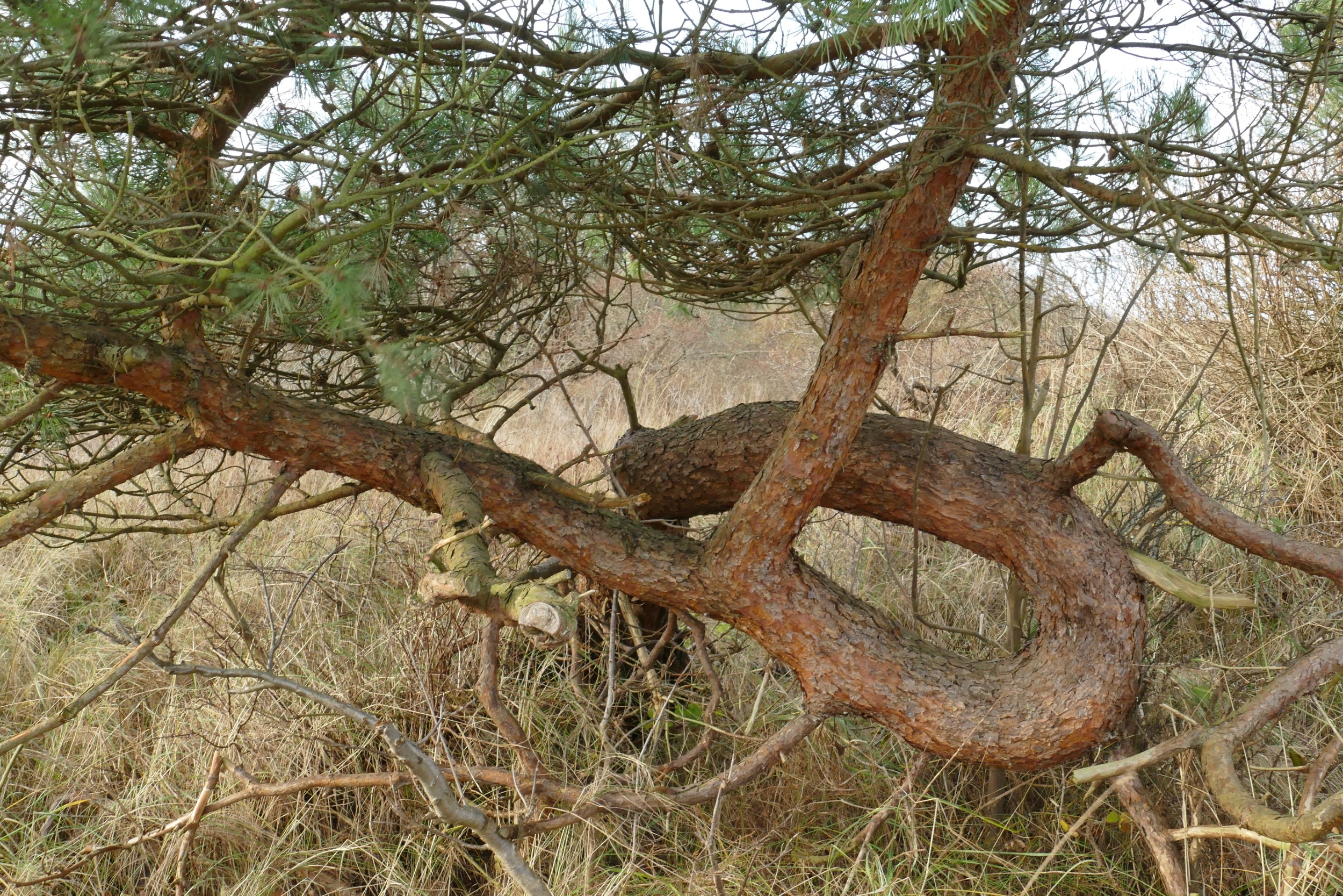 Je moet altijd een stukje over het fietspad lopen om bij het begin van de Hogeweg te komen. Hoe vaak hebben we hier al niet gelopen. Ik weet niet waar we gewoonlijk naar kijken, maar vandaag valt mijn blik op een wel bijzonder gevormd dennenboompje dat ik nog nooit eerder heb opgemerkt… Het symboliseert misschien wel de tijd waarin we leven: soms gaan de dingen anders dan anders en moet je je in allerlei bochten wringen om te overleven, maar uiteindelijk komt het goed en kun je weer verder groeien. Petje af voor dit boompje!